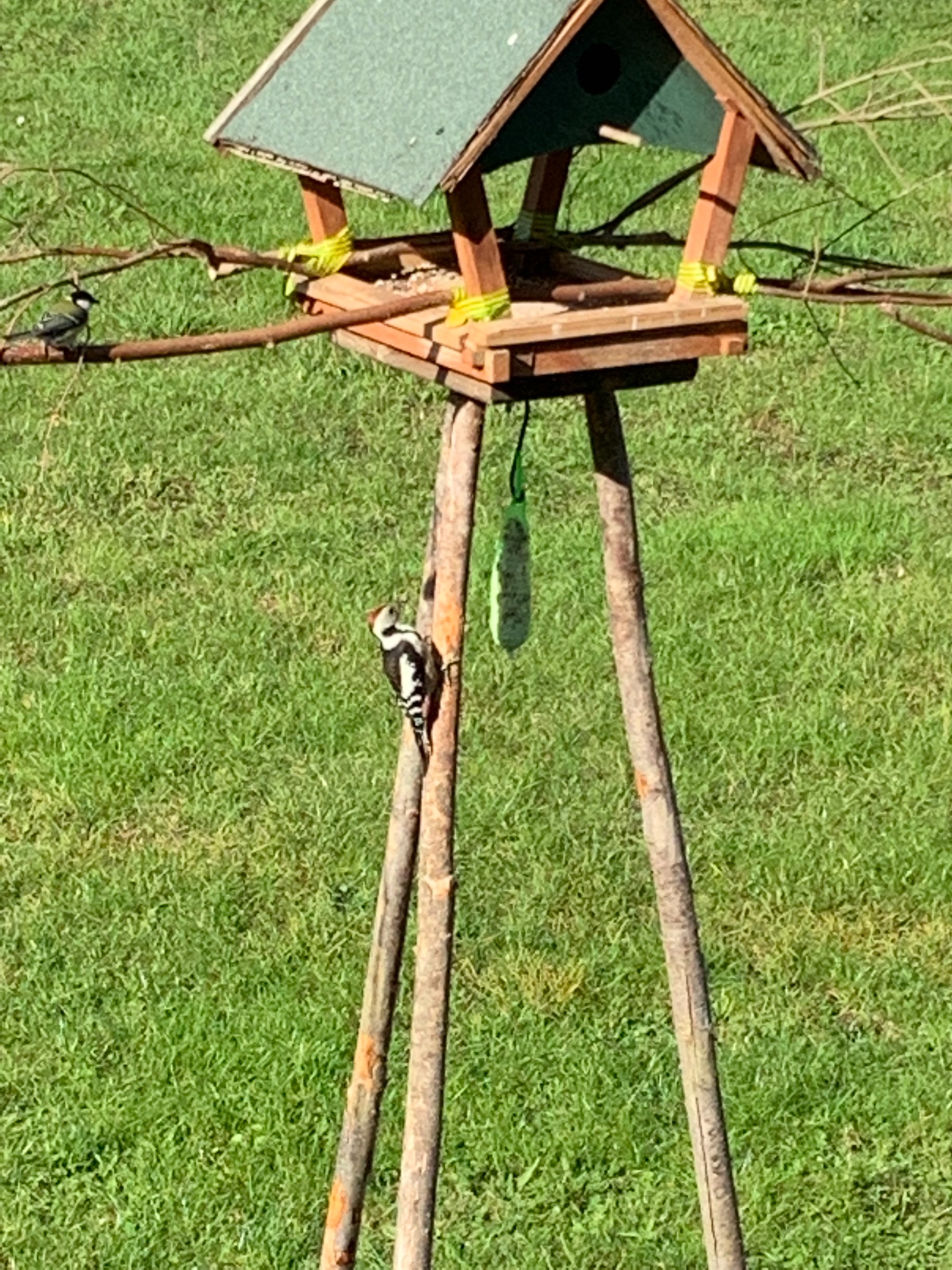 ja, die Vögel sind kräftig dabei, nehmen das Angebot gut an. Sie kennen es aber auch schon - mein auf die Schnelle zusammengebasteltes Dreibein steht dort bereits den ganzen Winter. Oft findet man Mäxchen darunter, der es liebt, heruntergefallene Fettkrümel auszulesen... ;-)