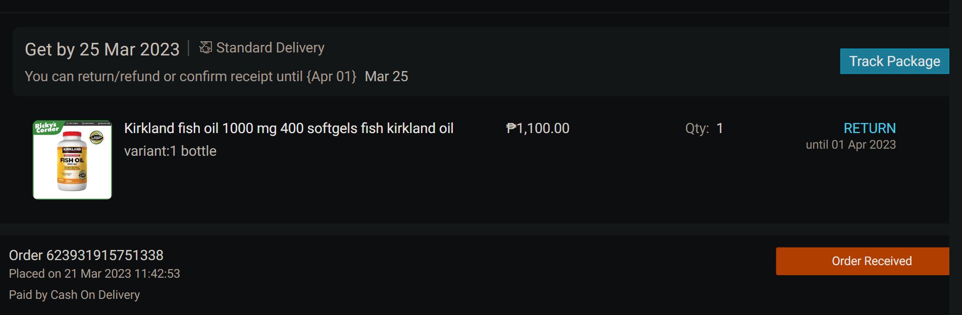 Compré un suplemento de aceite de pescado en una de las tiendas en línea más populares de mi país. Yo siempre comprar en línea porque es demasiado laborioso, consume mucho tiempo, y Además, resulta más caro porque tengo que gastar más en combustible, comida y también puedo comprar otras cosas debido a mi comportamiento impulsivo. Algunas de las cosas que compré antes no eran realmente necesarias porque no funcionaban como yo esperaba. Sin embargo, la mayoría de los artículos que he comprado me han sido útiles hasta ahora y, por supuesto, los suplementos que necesitaba para mejorar mi estado general.