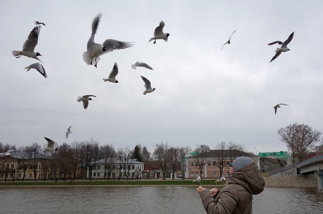 | На майские праздники 2021 г. мы с друзьями отдыхали в Вологде. В день отъезда погода была пасмурная, временами дождливая, но мы пошли на прогулку. На набережной сидела большая стая птиц. У моей подруги был с собой хлеб, и она решила покормить чаек, но так, чтобы они поохотились за добычей в полёте. | On the May holidays of 2021, my friends and I rested in Vologda. On the day of departure, the weather was cloudy, sometimes rainy, but we went for a walk. A large flock of birds sat on the embankment. My friend had bread with her, and she decided to feed the seagulls, but in such a way that they would hunt for prey in flight. |