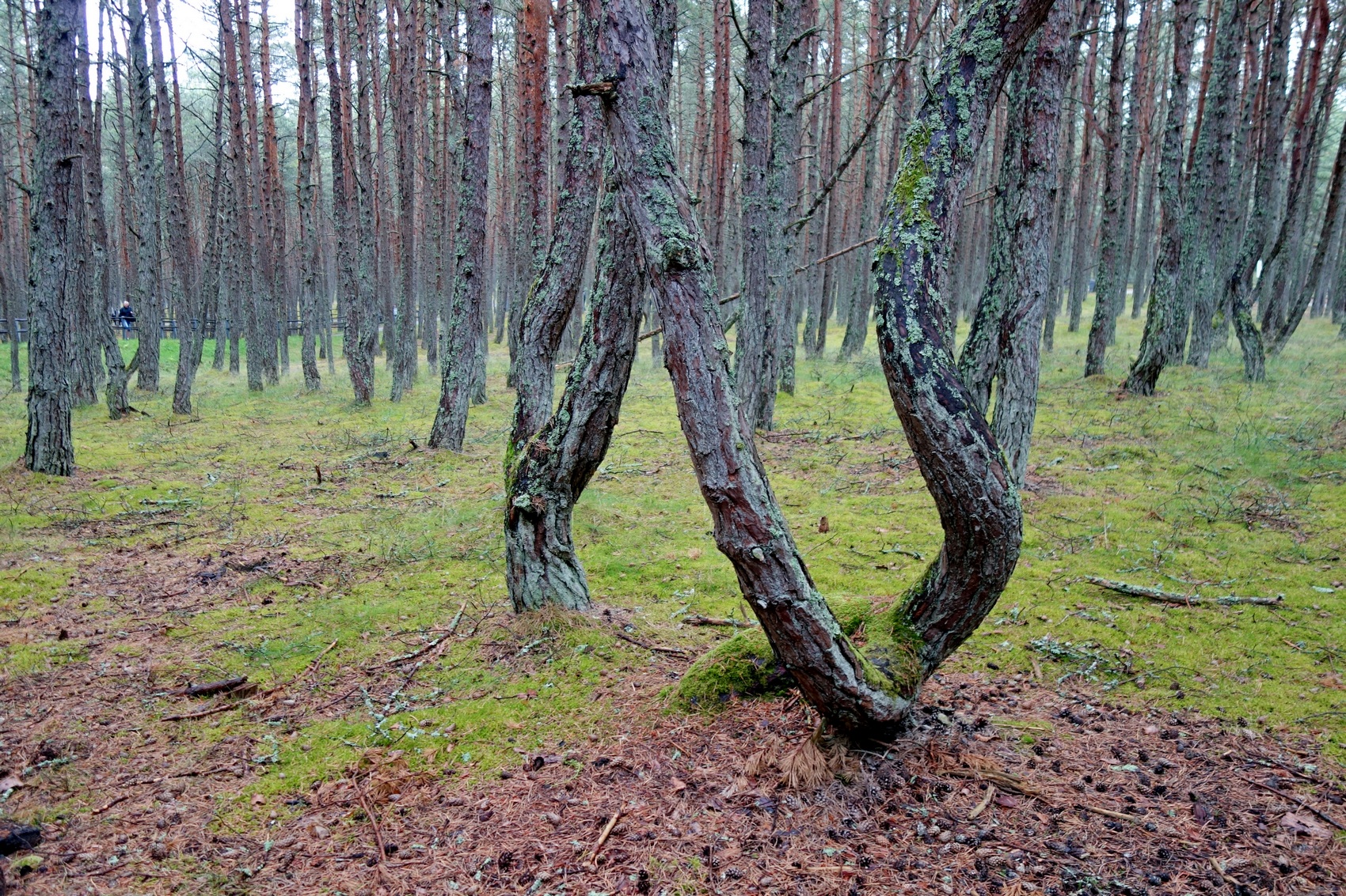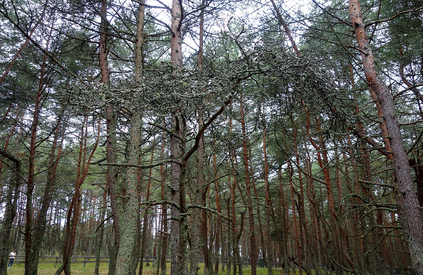 Сосновый лес, обычно радующий глаз яркими медными красками, на Куршской косе густо покрыт светло-зелеными лишайниками. Танцующие сосны странного цвета создают невероятное сказочное впечатление. The pine forest, usually pleasing to the eye with bright copper colors, is densely covered with light green lichens on the Curonian Spit. The dancing pines of a strange color create an incredible fairy-tale impression.