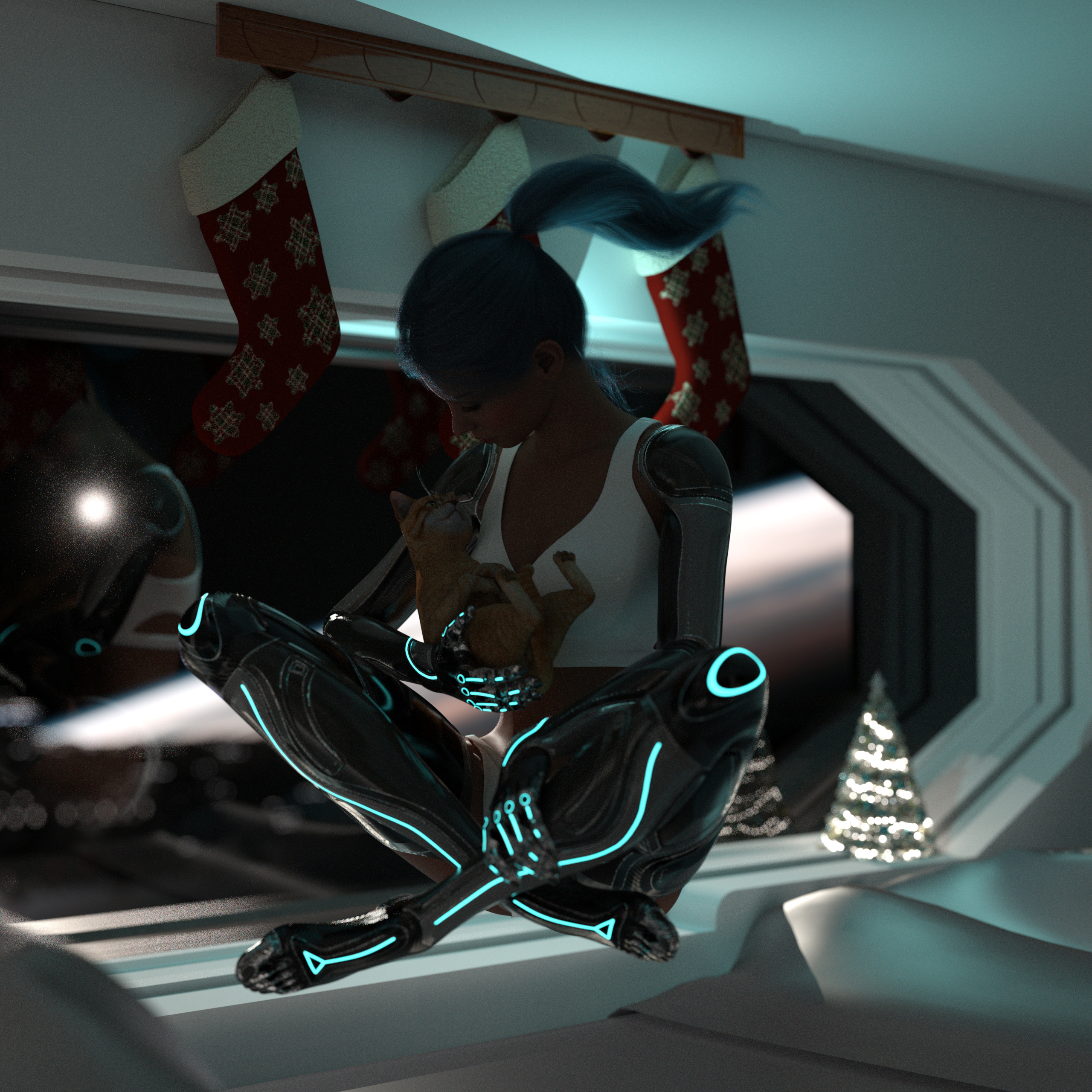 Merry Christmas everybody. Here is an android, on a space station, in orbit, holding a kitty, with Christmas decorations :)