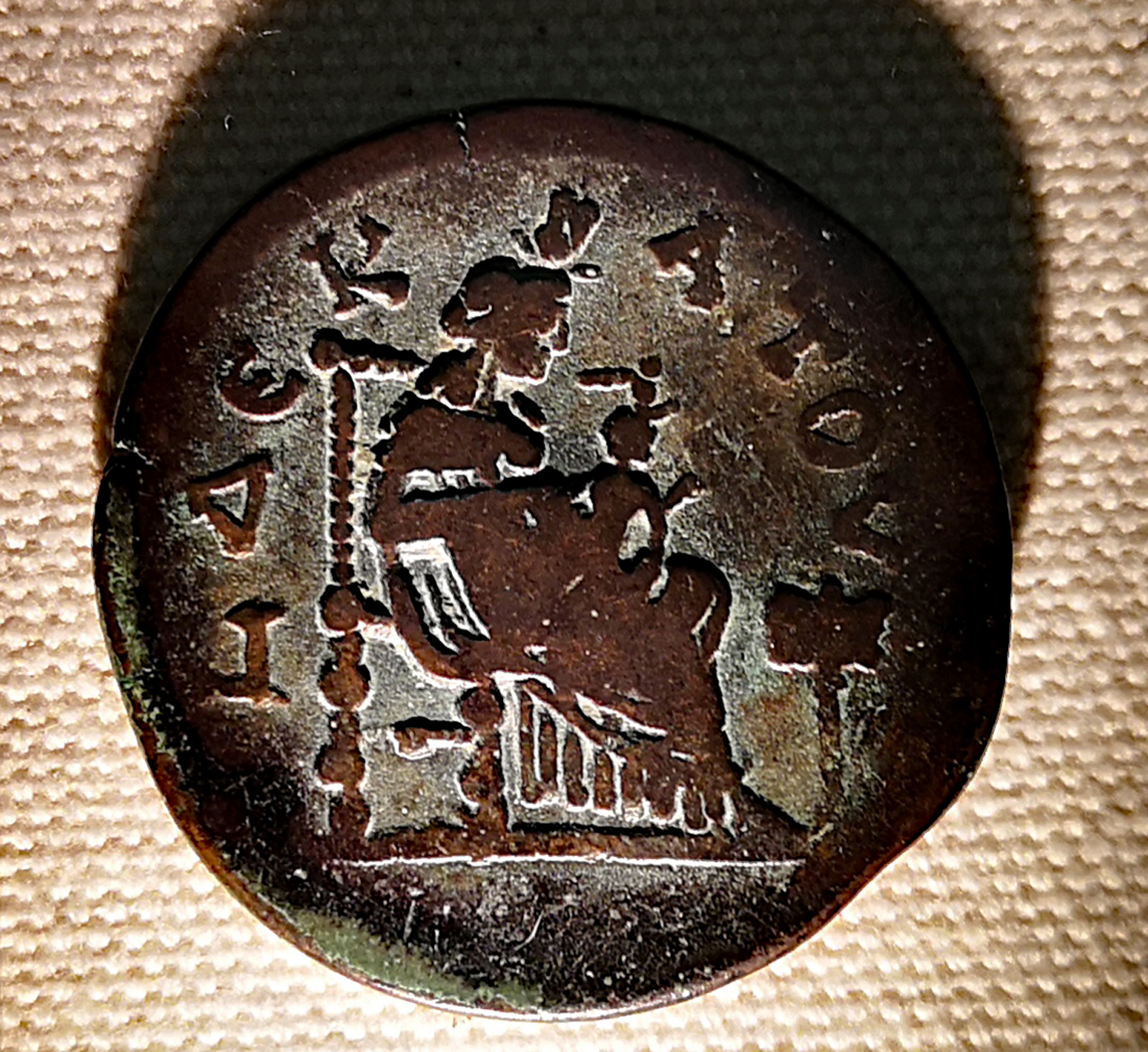 Darstellungen der Göttin Isis auf Münzen waren vor allem in Alexandrien seit dem 2 Jh. v. Chr. beliebt. Hier ist Isis sitzend, mit dem Horusknaben auf ihrem Schoß, dargestellt.