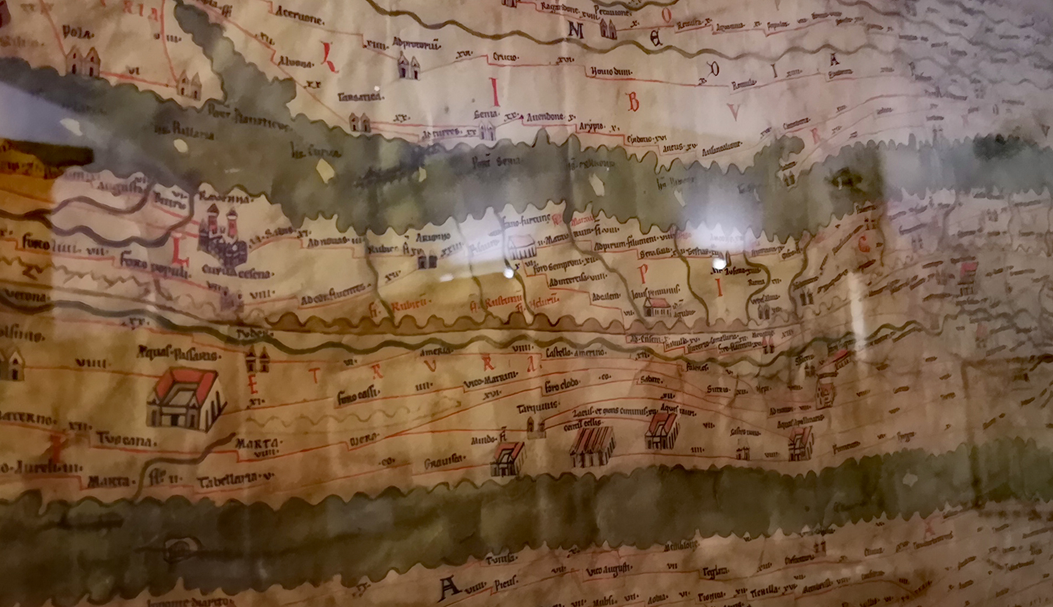 The Tabula Peutingeriana represents the road system in the late Roman Empire and visualizes geographical, political and cultural connections. The most important cities Rome, Constantinople and Antioch are marked by miniatures of their city gods.