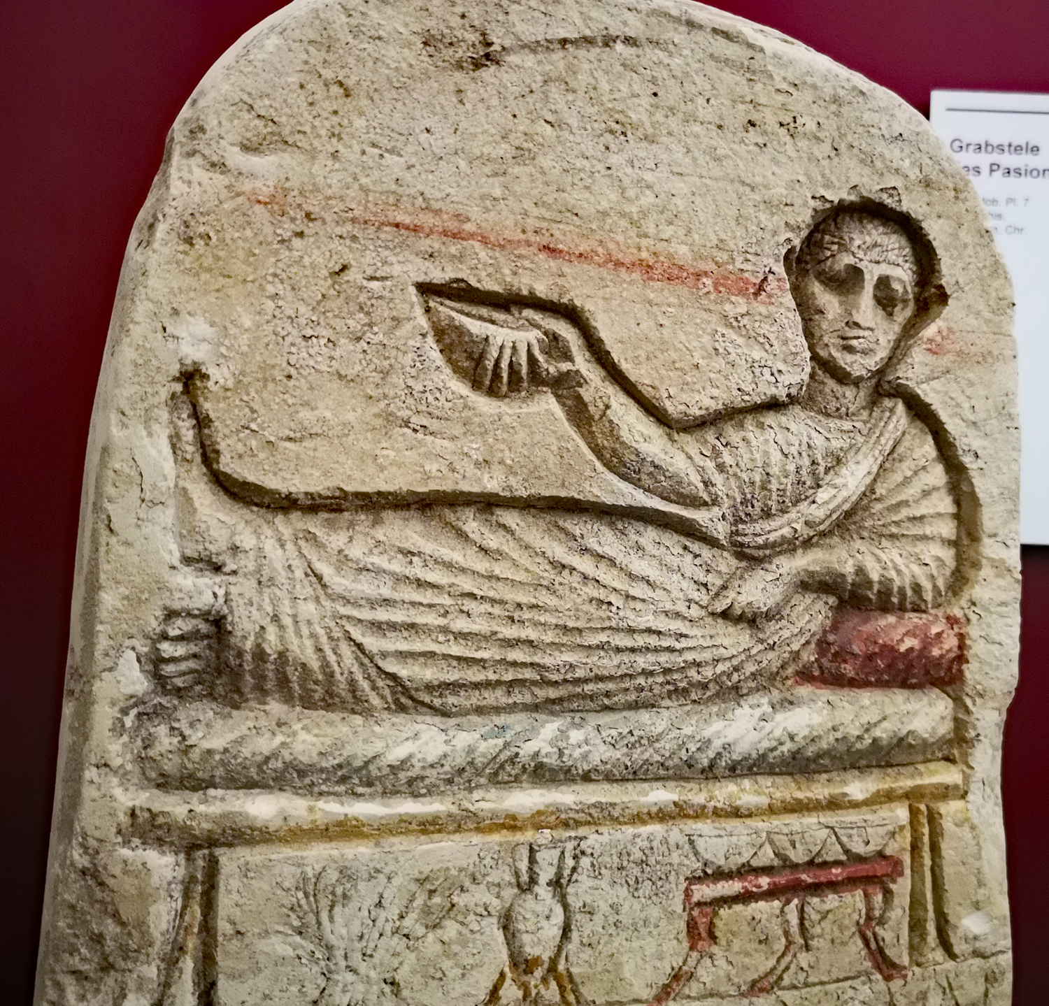 Steles were used as tombstones. The representation usually followed a uniform type. The deceased rests on a lounger, beneath him a bundle of ears of corn, a pointed amphora and a table with the offerings for the funerary banquet are depicted.