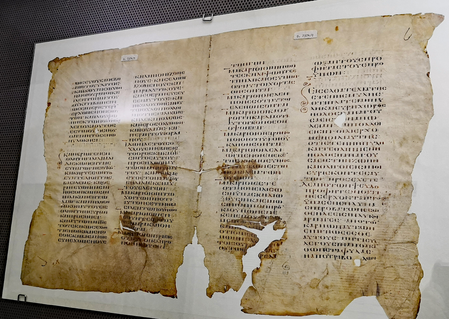 Der Ausschnitt eines Evangeliars (5. Jh. n. Chr.) enthält Abschnitte aus der Bergpredigt nach dem Evangelium nach Matthäus.
