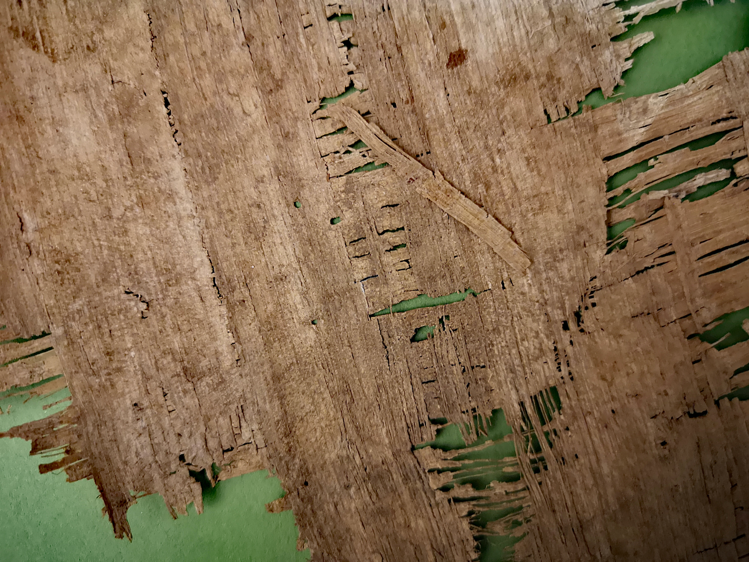 The technique of papyrus production was evolved in Egypt around 3000 BC. The triangular stems of the papyrus plant are first skinned, cut into thin strips and soaked in water. Then the strips are beaten soft until they are almost transparent. Now the strips are placed in two layers (90° to each other), like the pattern of a chessboard. After this procedure the material is covered with a cloth and pressed. The released plant sap, which functions like an adhesive, form the strips to a firm sheet, which can be written on after drying.