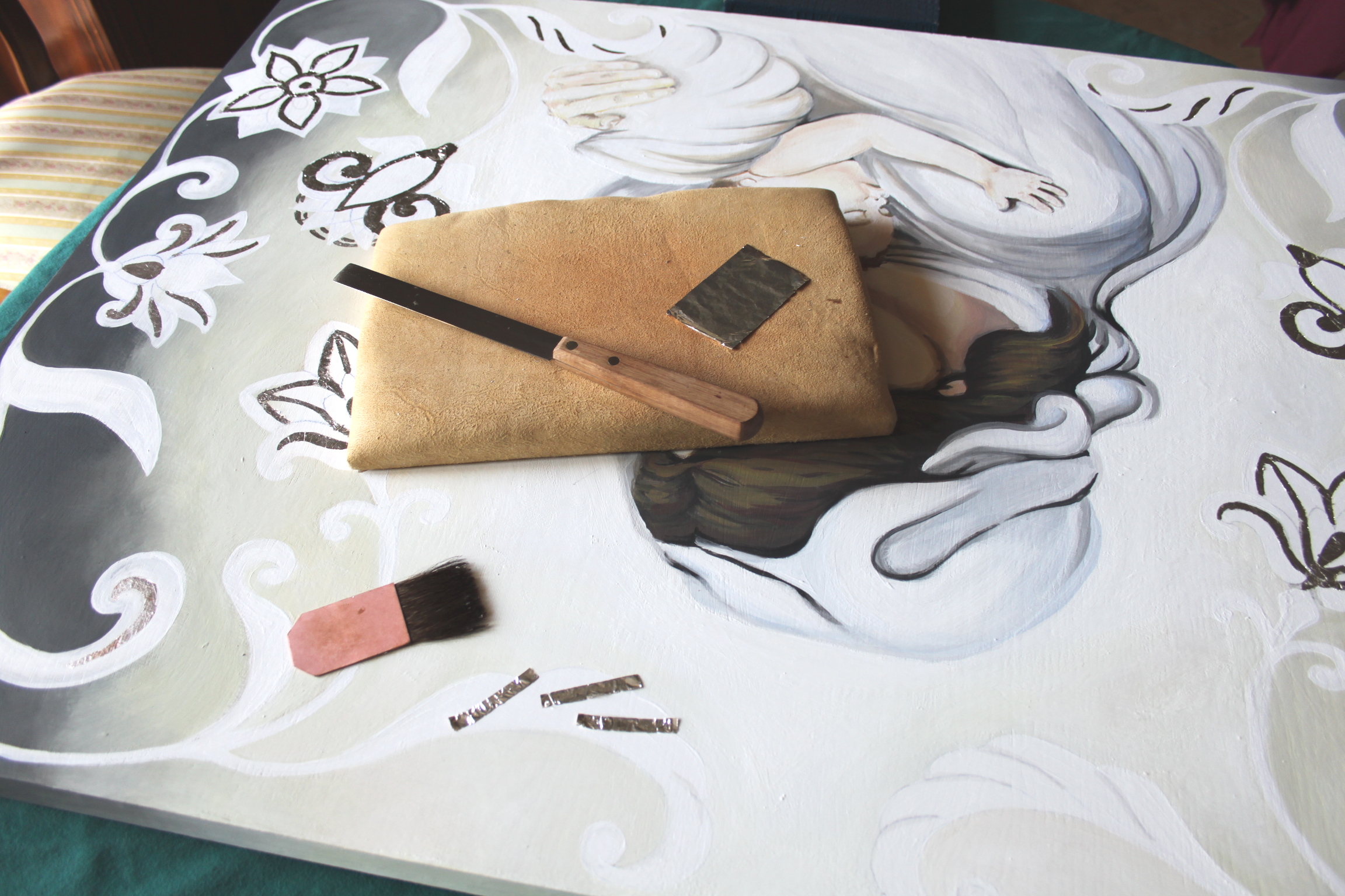Munita di libretto di foglie d’argento, missione, cuscinetto, coltello, e pennello di vaio da doratore, ho iniziato stendendo la colla sulle parti da argentare, poi si deve attendere 10/15 minuti prima di applicate la foglia.