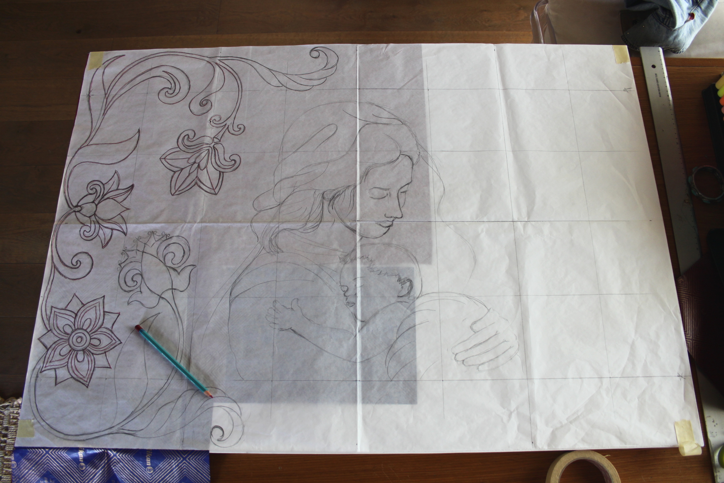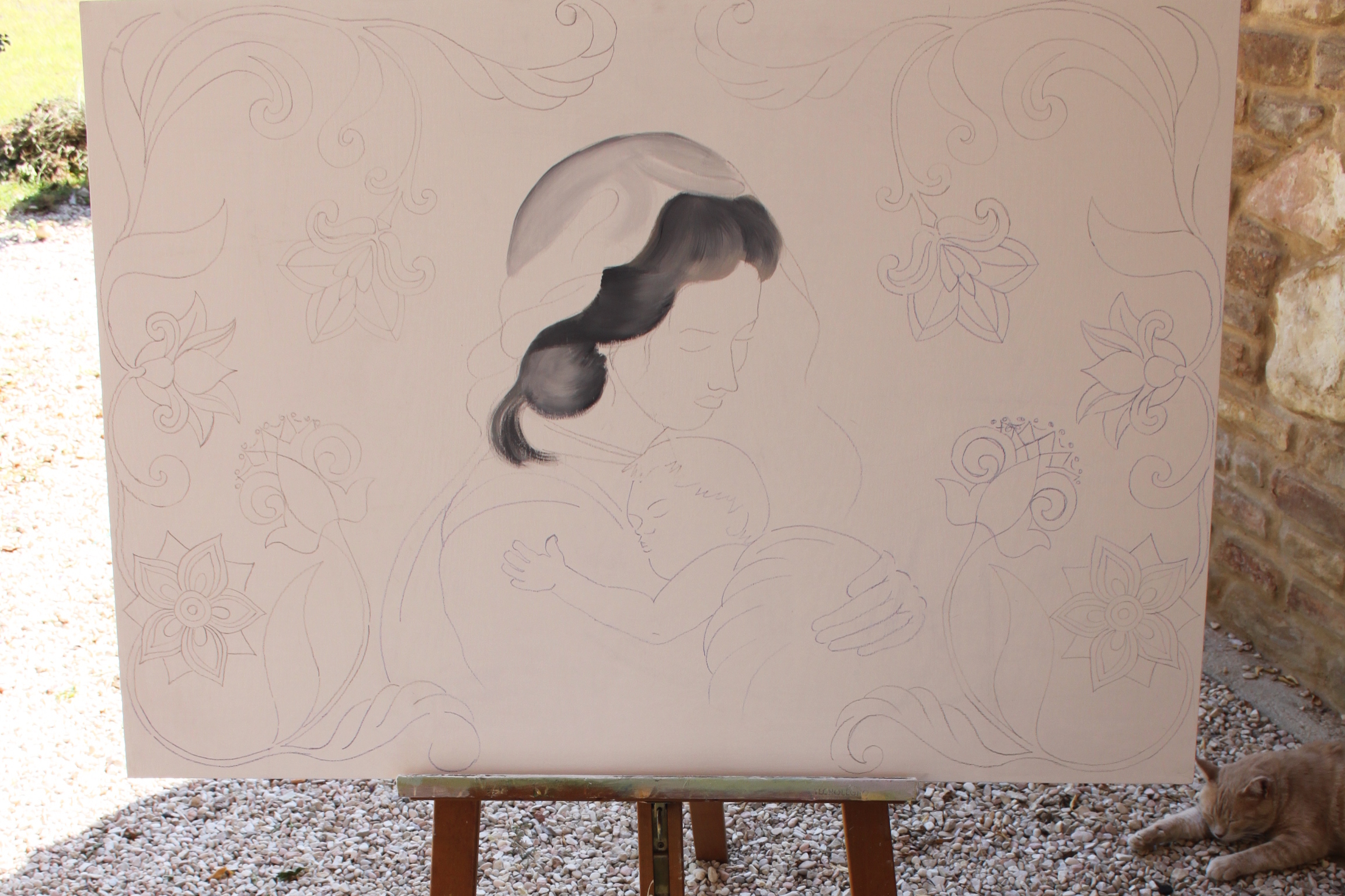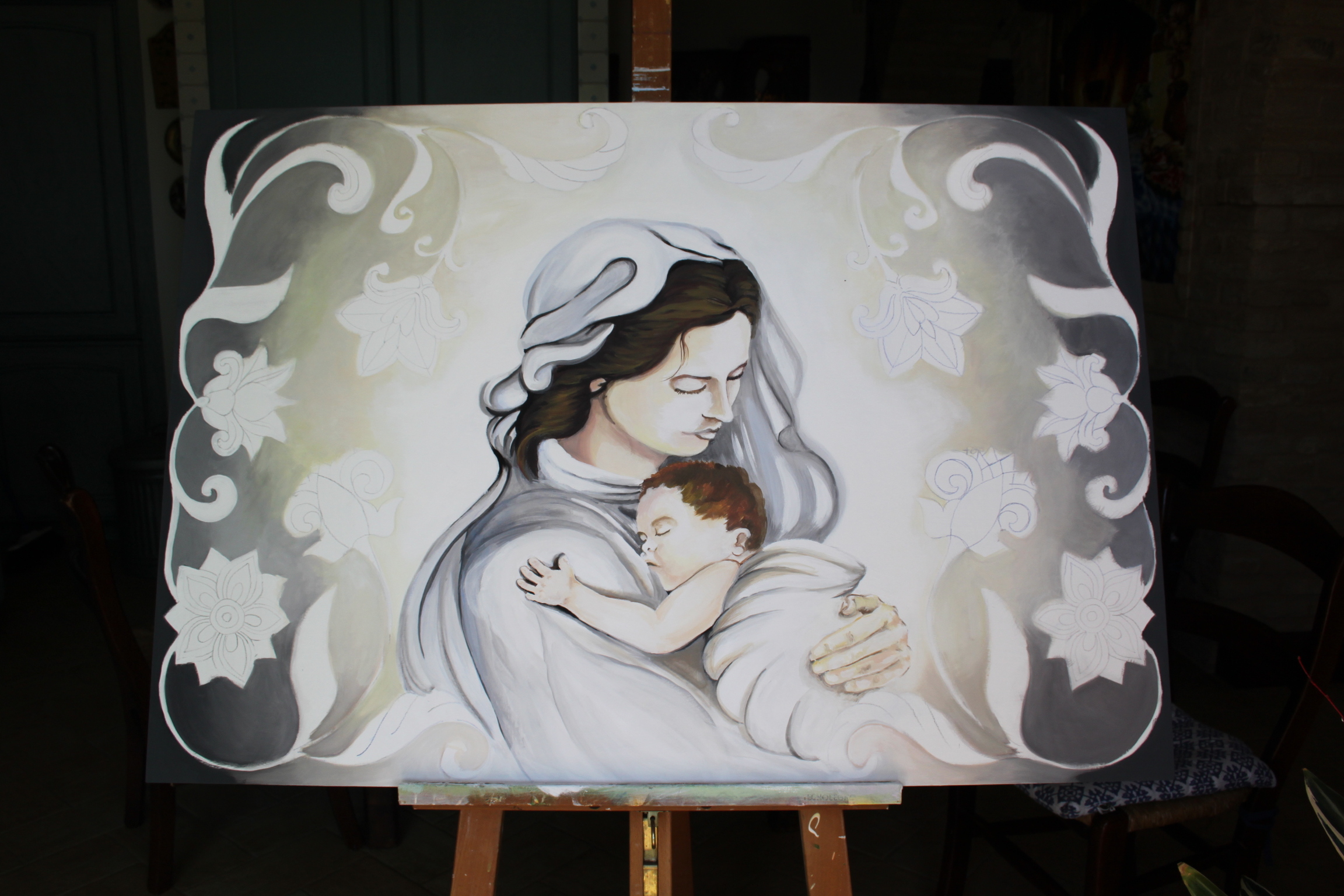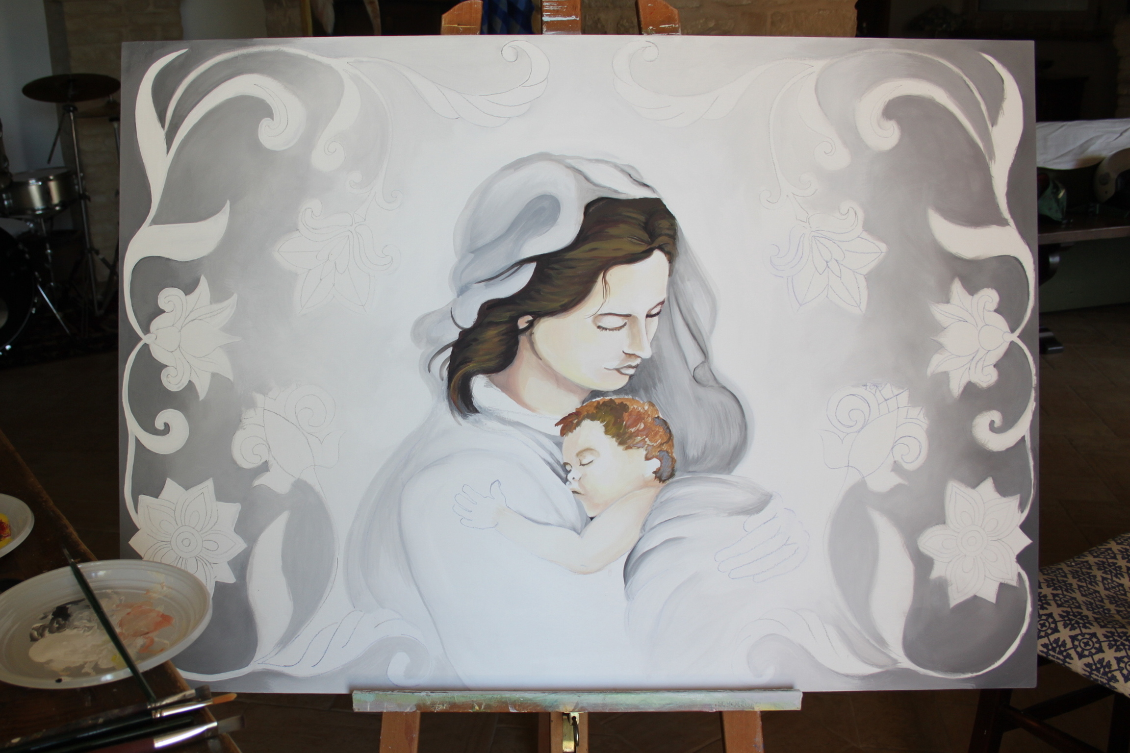 Il bambino inizia a prendere forma, insieme al suo corpicino coperto dal panneggio bianco e al velo della Madonna, anche lo sfondo acquista una calda velatura.