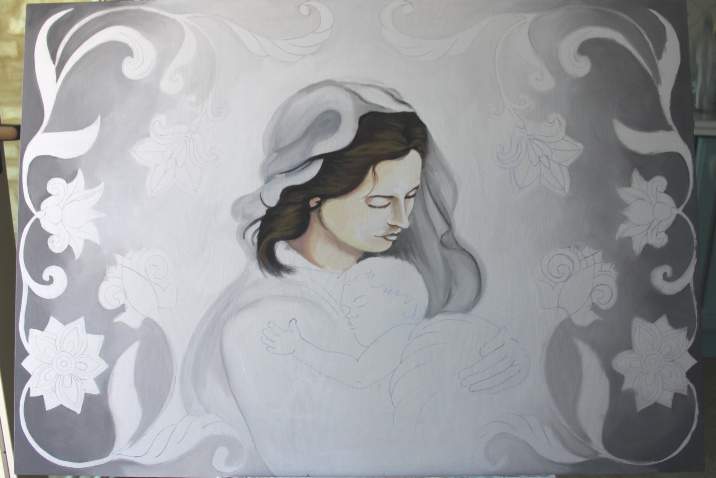 I started to painting with oil colors, starting with the face and hair of the Madonna.