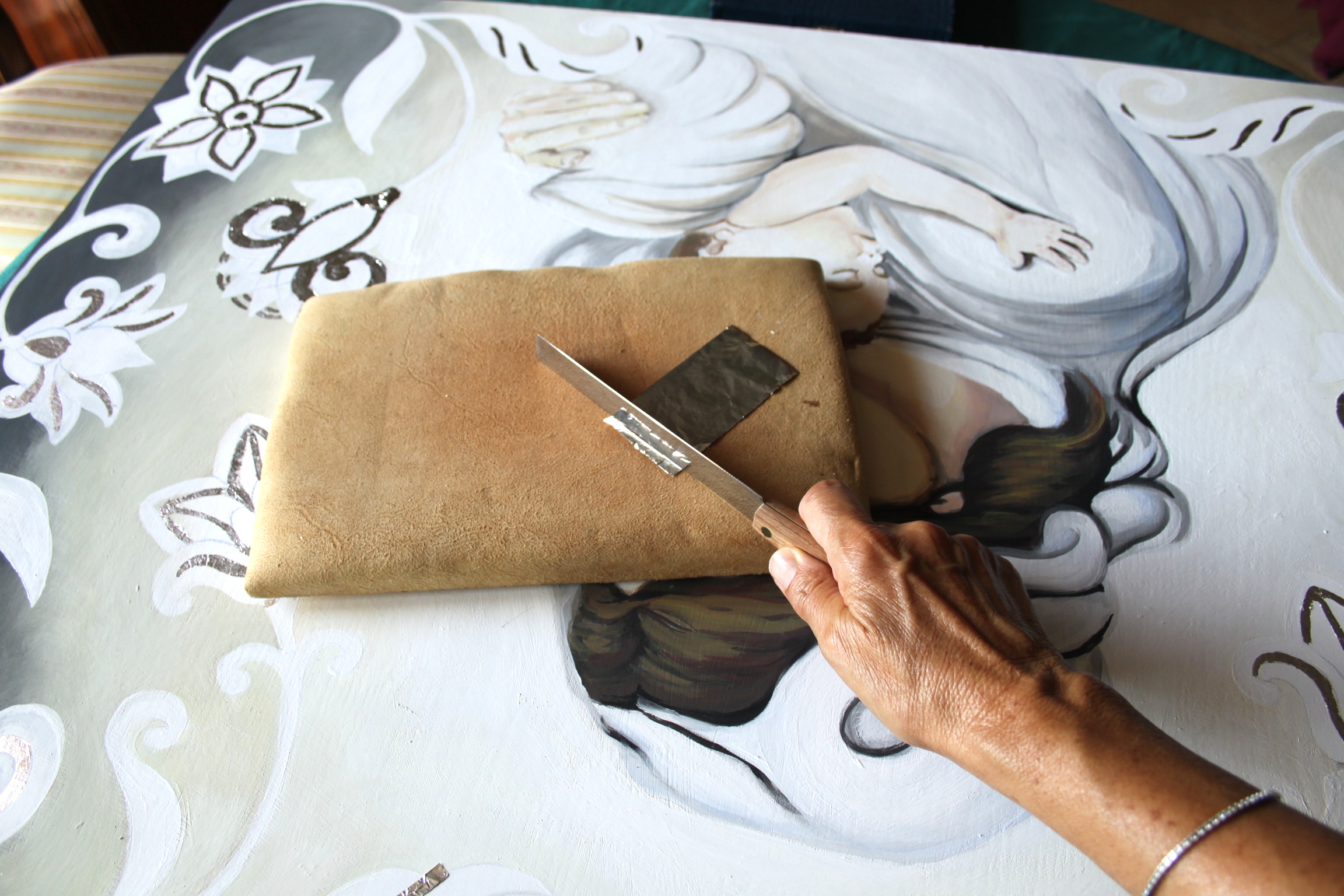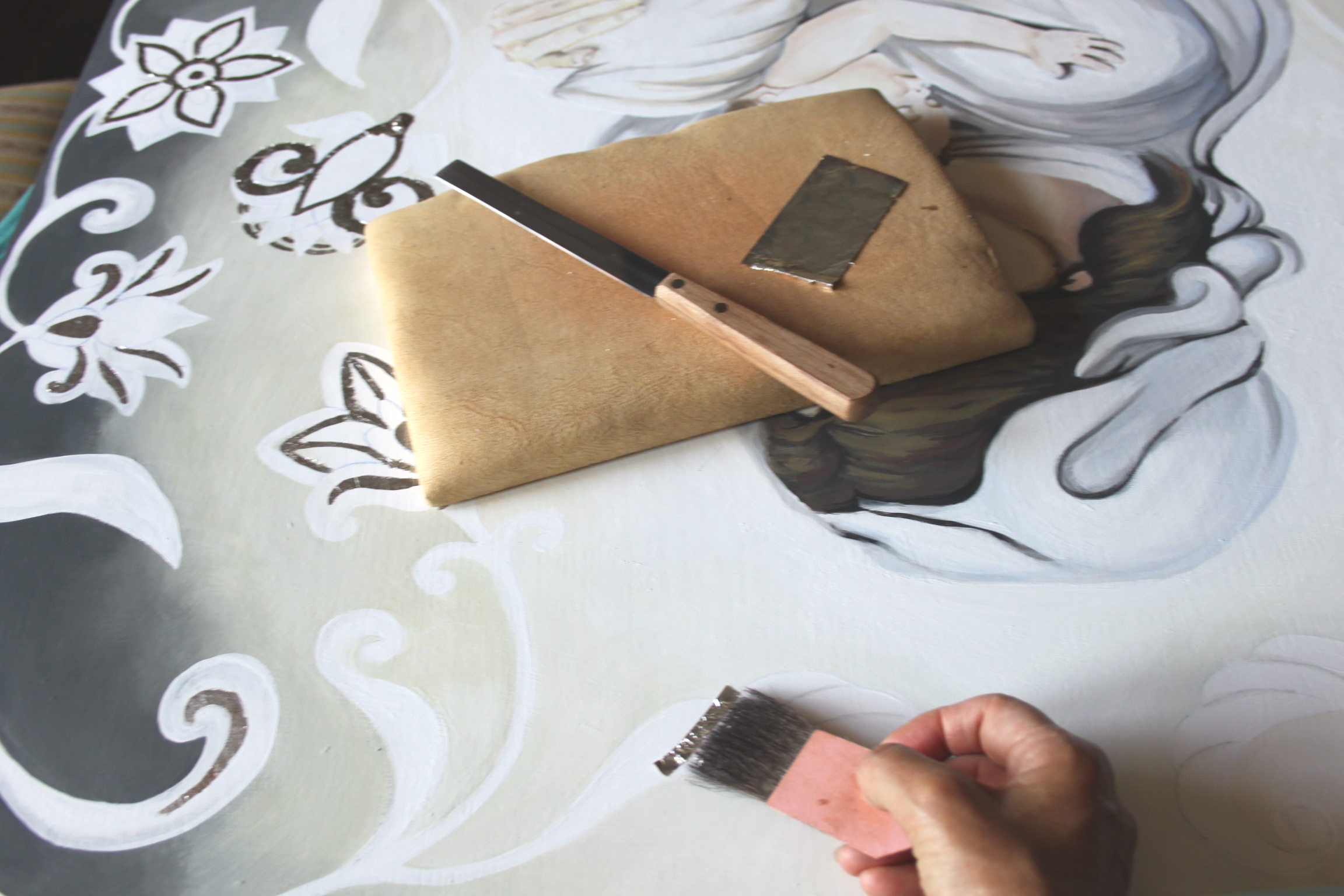 Una volta applicata la foglia si fa asciugare per qualche ora poi si procede con un pennello morbido a togliere i lembi di foglia in eccesso, poi si ritocc il tutto.