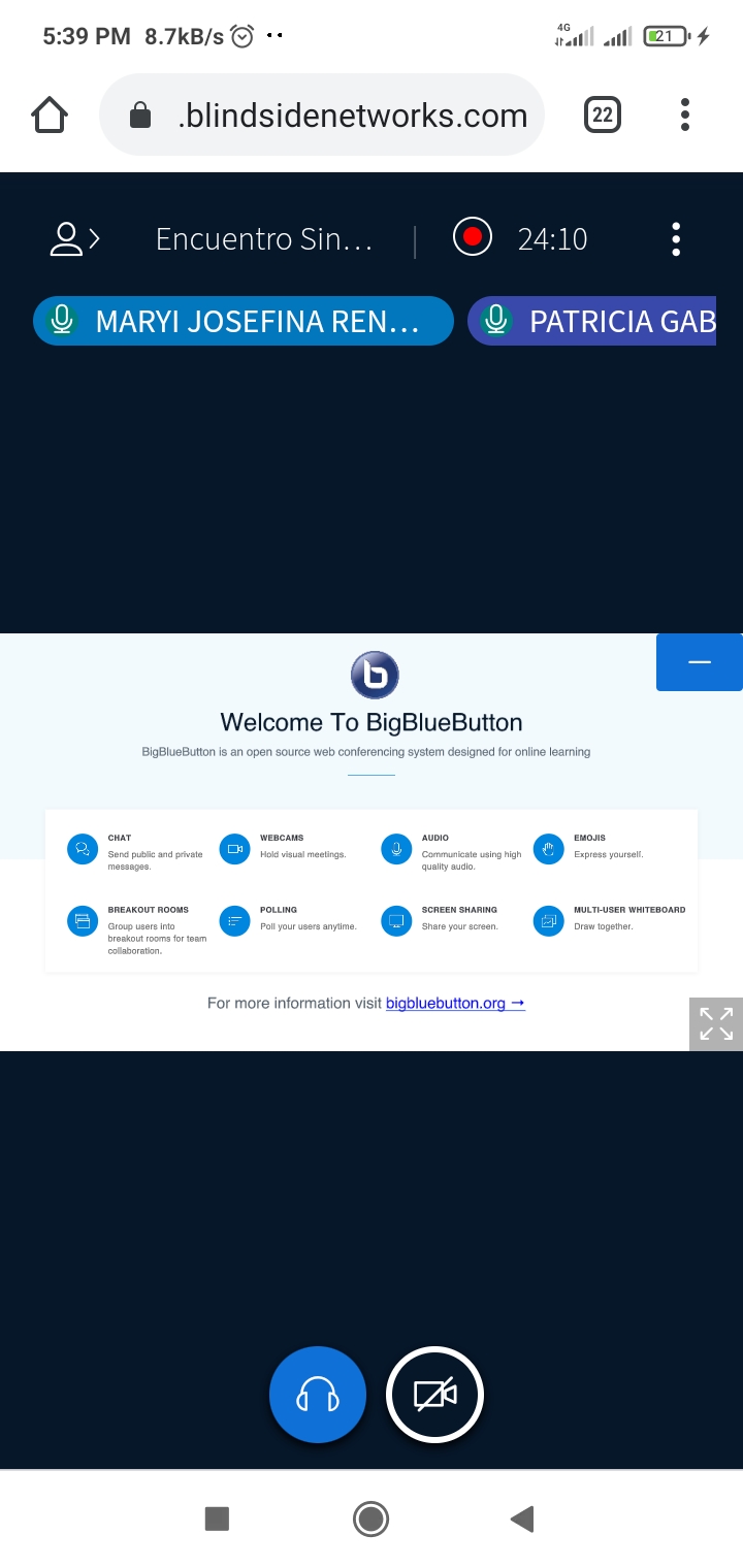 Una vez en casa active mi celular, nuevamente llegue algo tarde por la señal, pero solo fueron 15 min y hoy si escuché la clase y pude intervenir de forma, por texto, ya que por micrófono, aún no lo sé hacer desde esa aplicación por celular,se llama bigbluebutton.