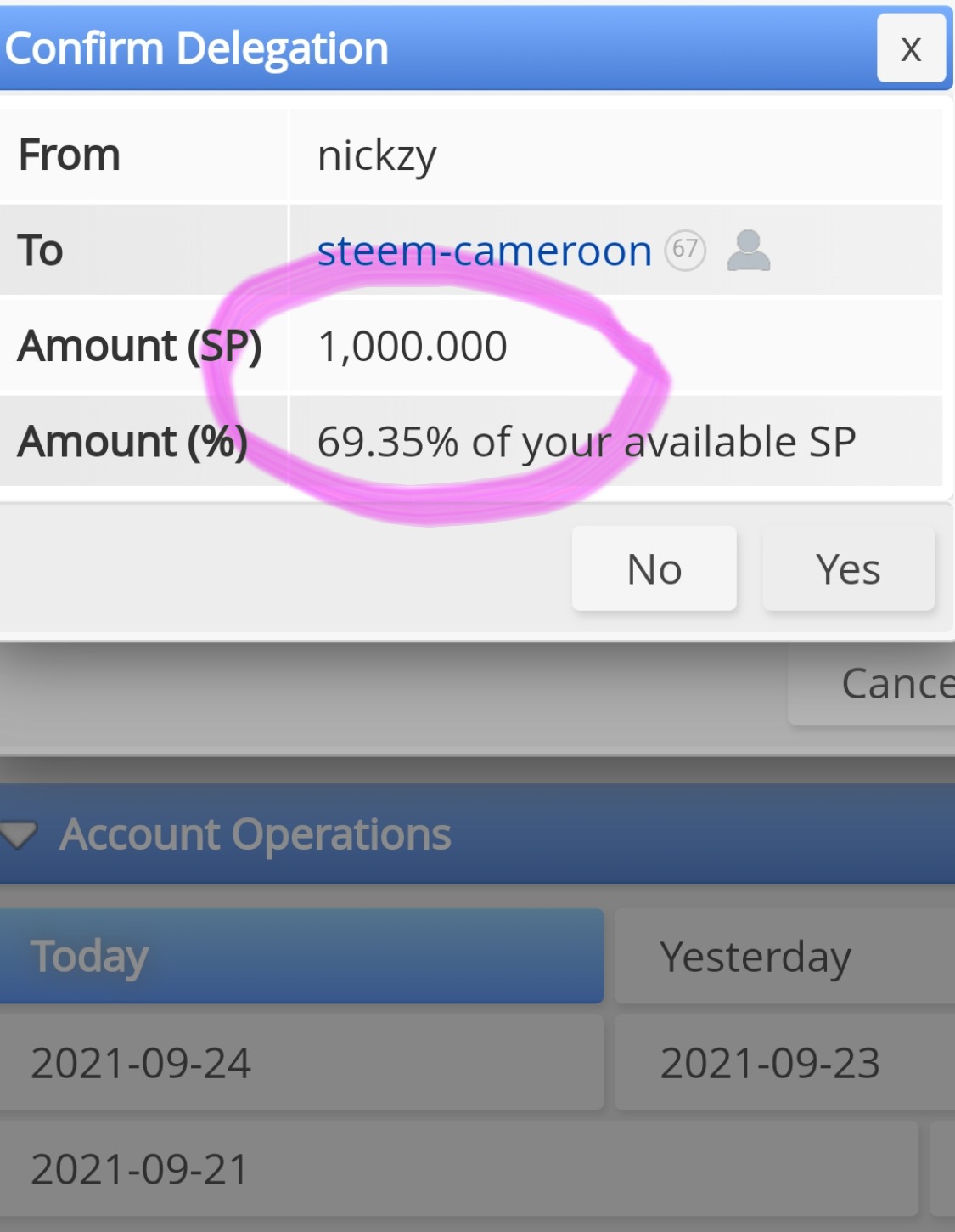Clicked on yes and comfirmed with my private key, as you can see on the below image 1000sp delegated to @steem-cameroon