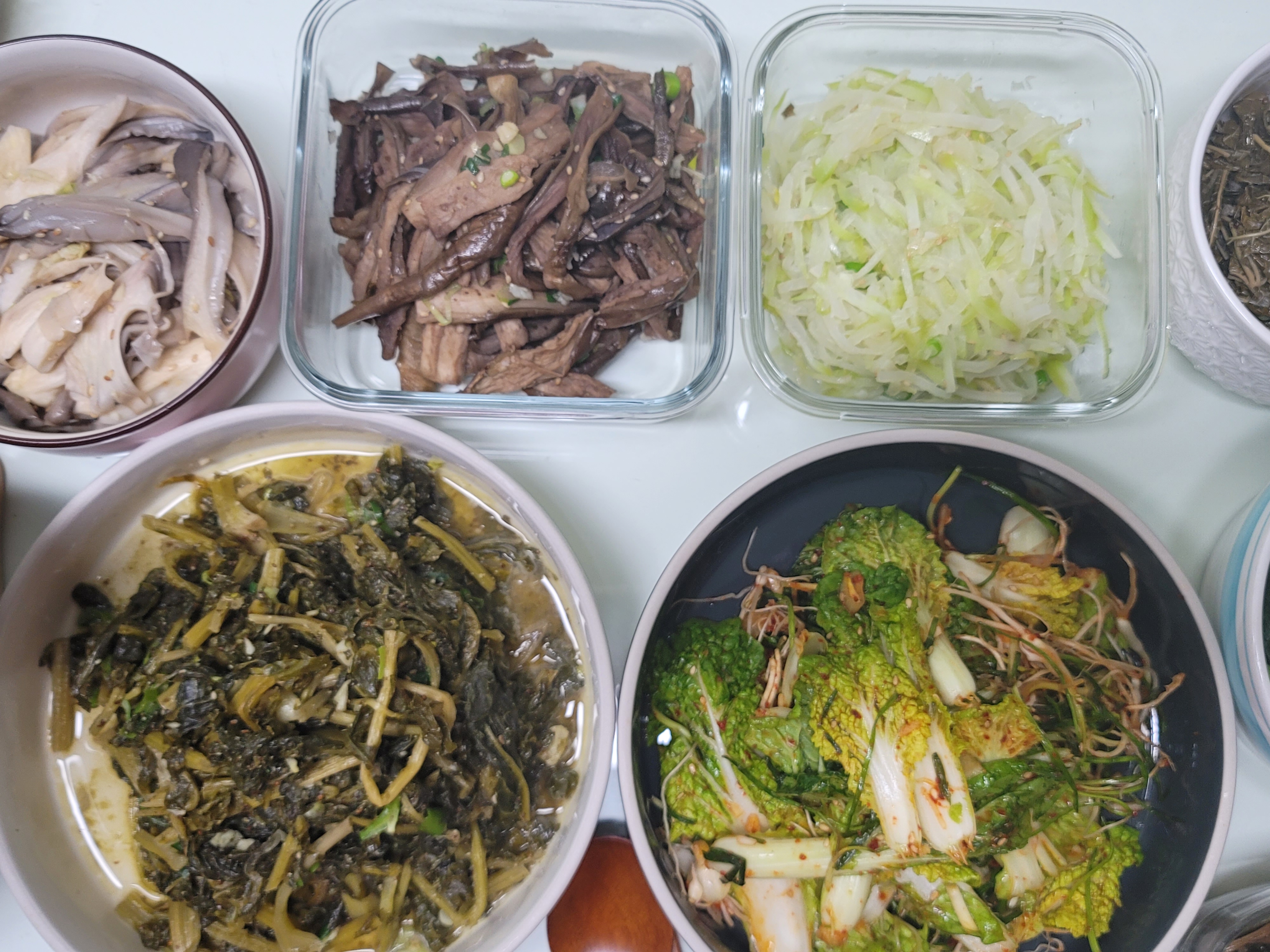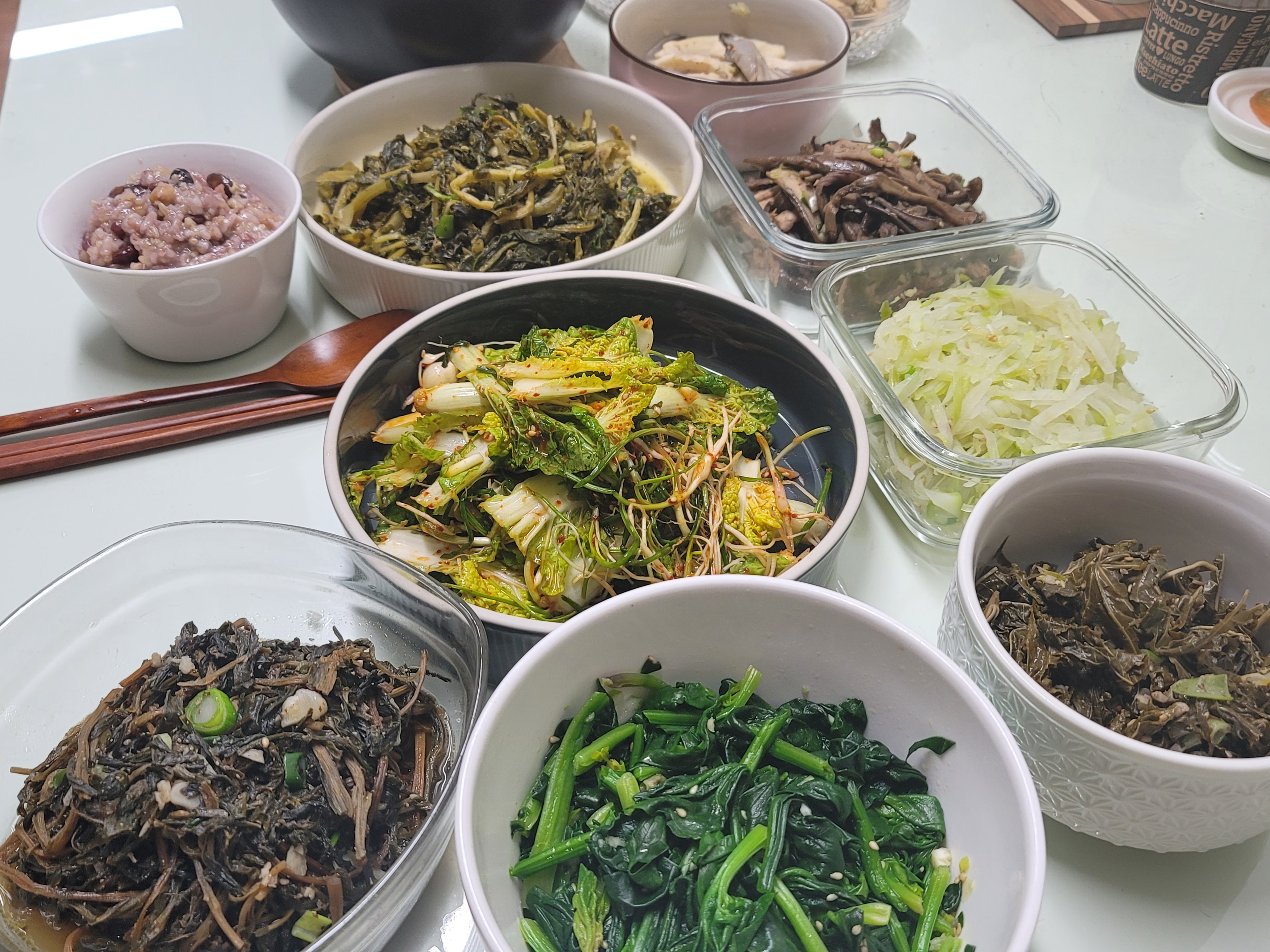 준비된 묵은 나물은 시래기, 아주까리, 망초대, 가지가 있었어요. 엄마가 주신 것도 있고, 친구가 보내준 것도 있고, 제가 산 것도 있어요.