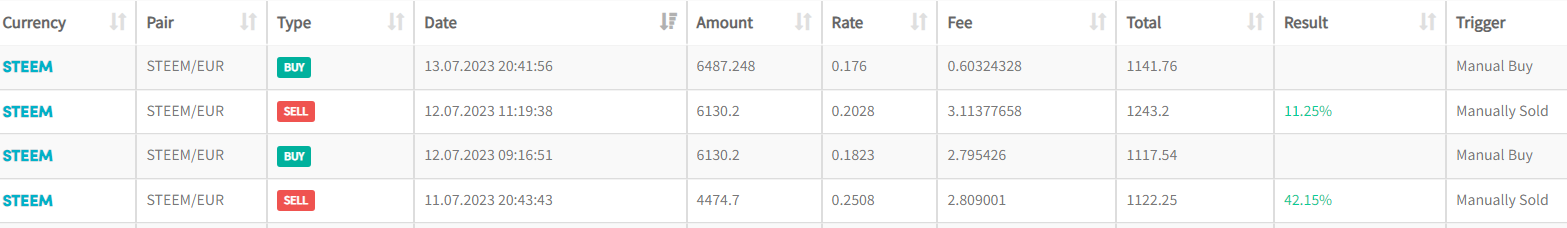 Nicht schlecht - da ich auf einer Börse noch 4474.7 Steem herumliegen hatte und den richtigen Zeitpunkt durch Zufall mitbekommen habe konnte ich als mal wieder eine Kursmanipulation stattgefunden hat verkaufen - dann neu kaufen und wiederum verkaufen und nach dem der Kurs dann abermals gefallen war wieder einsteigen.