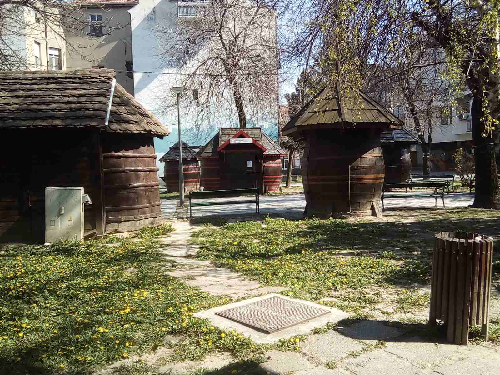 And this is a small park that I really like. You can buy a glass of wine in one of the small wooden houses, sit on a bench and relax, enjoying the music of a blind guitarist, which gives a special charm to this place. And now there was no one, a blind guitar player or people enjoying his music.