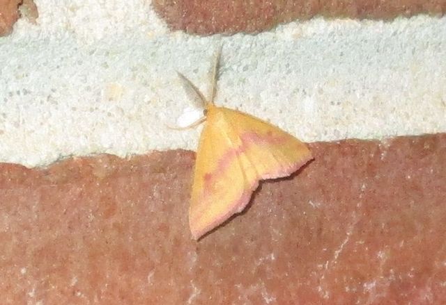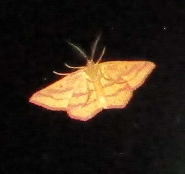 This pretty yellow and pink Chickweed moth (Haematopis grataria) is small with a wingspan of 3/4" to 1". A male is in the first 2 photos. How do I know it is a male? Because the antennae look feathery on males and females have thread-like antennae. Other than the antennae, males and females look the same.