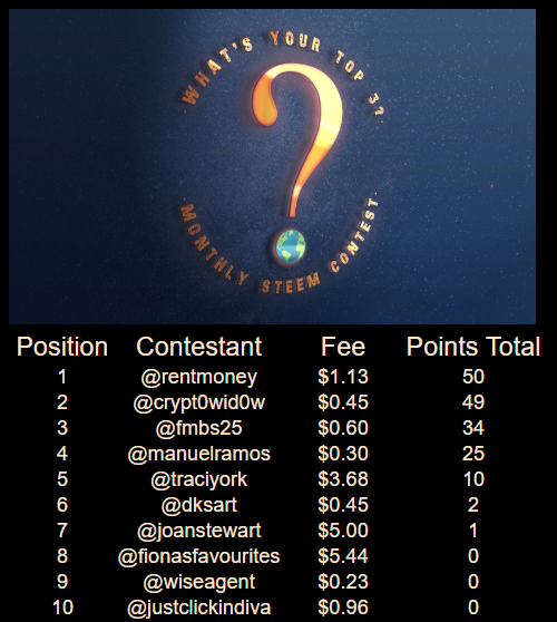 Using dpoll, we let you, the STEEM community, vote for your favorites thus giving us this month’s results! We then assign points to those voting positions and add up the three nominations for each contestant to make a final league table.
