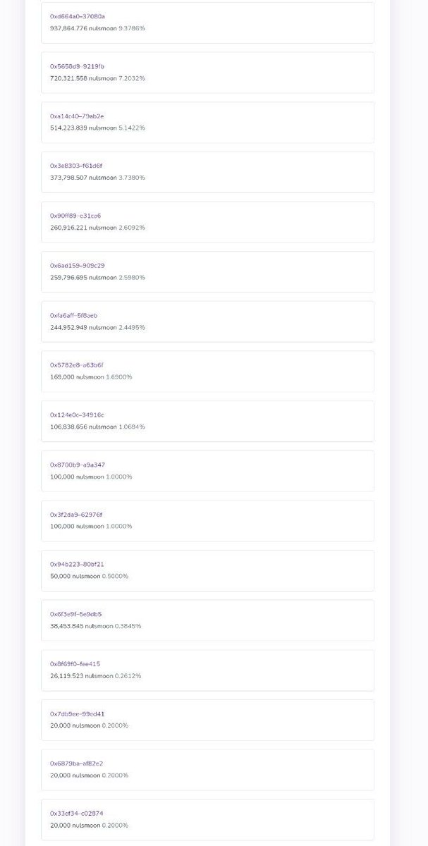 Top 17 NULSMOON holders with average ownership of 0.2% - 9% of the total supply. Are you there?