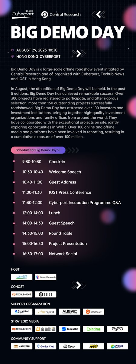 📢 Save the date! August 29th - 6th BIG DEMO DAY at #Cyberport. Co-org by @CentralResearc3, @News_Techub, and #IOST. 🥳