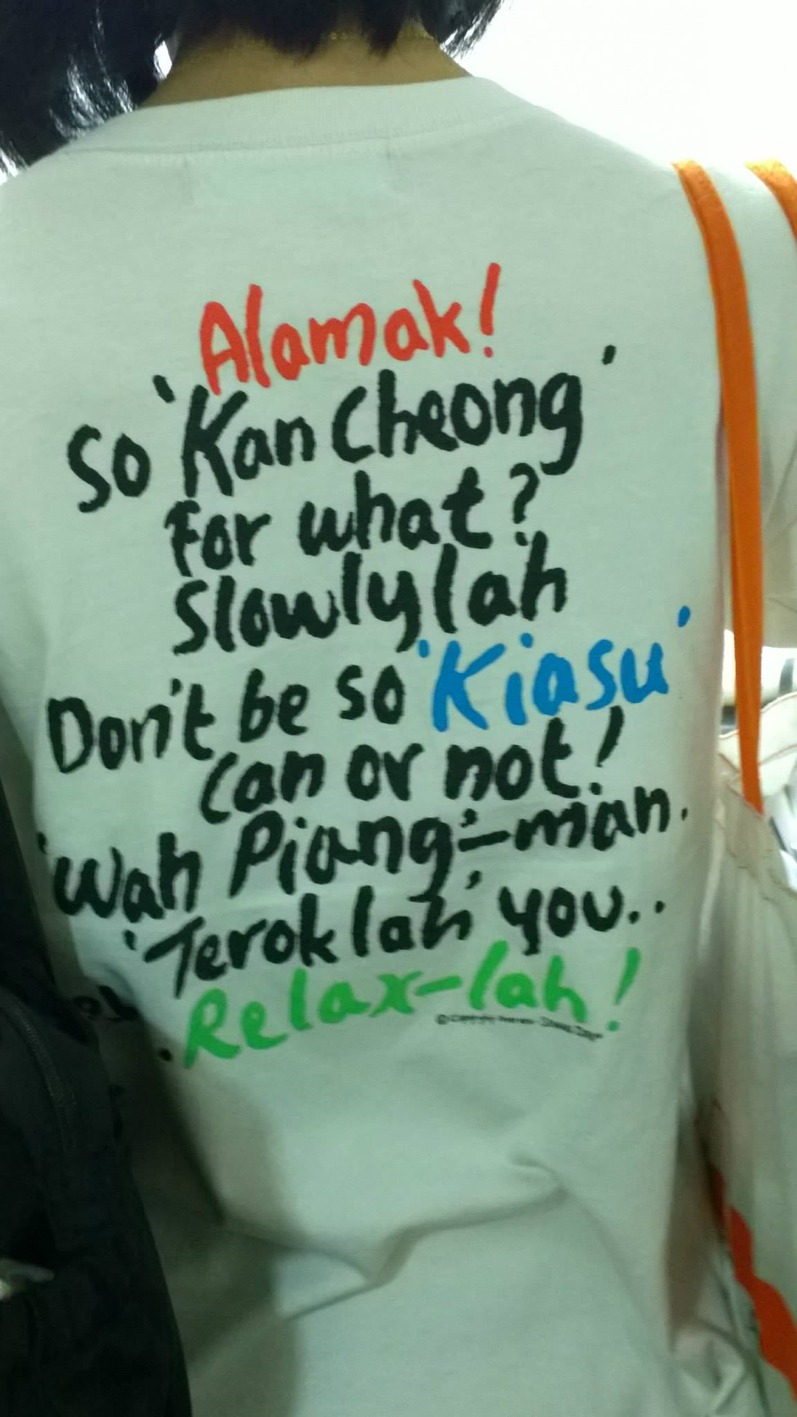 為了讓大家更能明白為何我對新加坡式英語有這種感受,不如一起看看以下這件衣服上的文字。