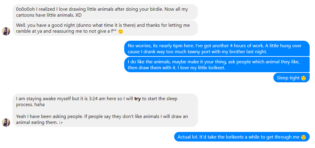 She had a fantastic sense of humour, and I'm sure she'd be cool that I've shared this with the rest of her friends in the community; particularly as a reminder to always be kind.