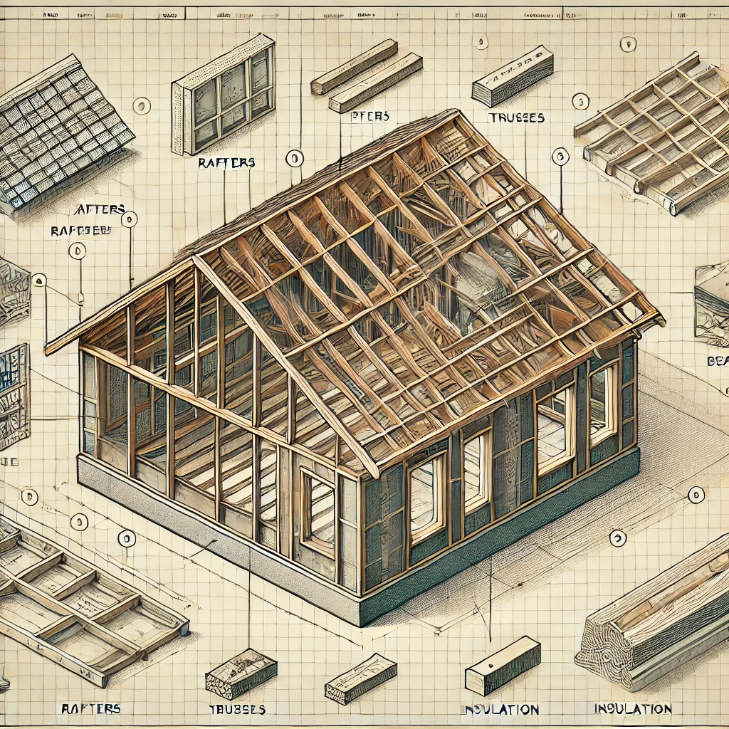 Trusses are pre-fabricated frameworks of triangles used to support the roof. They provide a more efficient and stronger support structure compared to traditional rafters. Trusses distribute the load evenly and allow for larger spans without the need for interior walls. - Beams