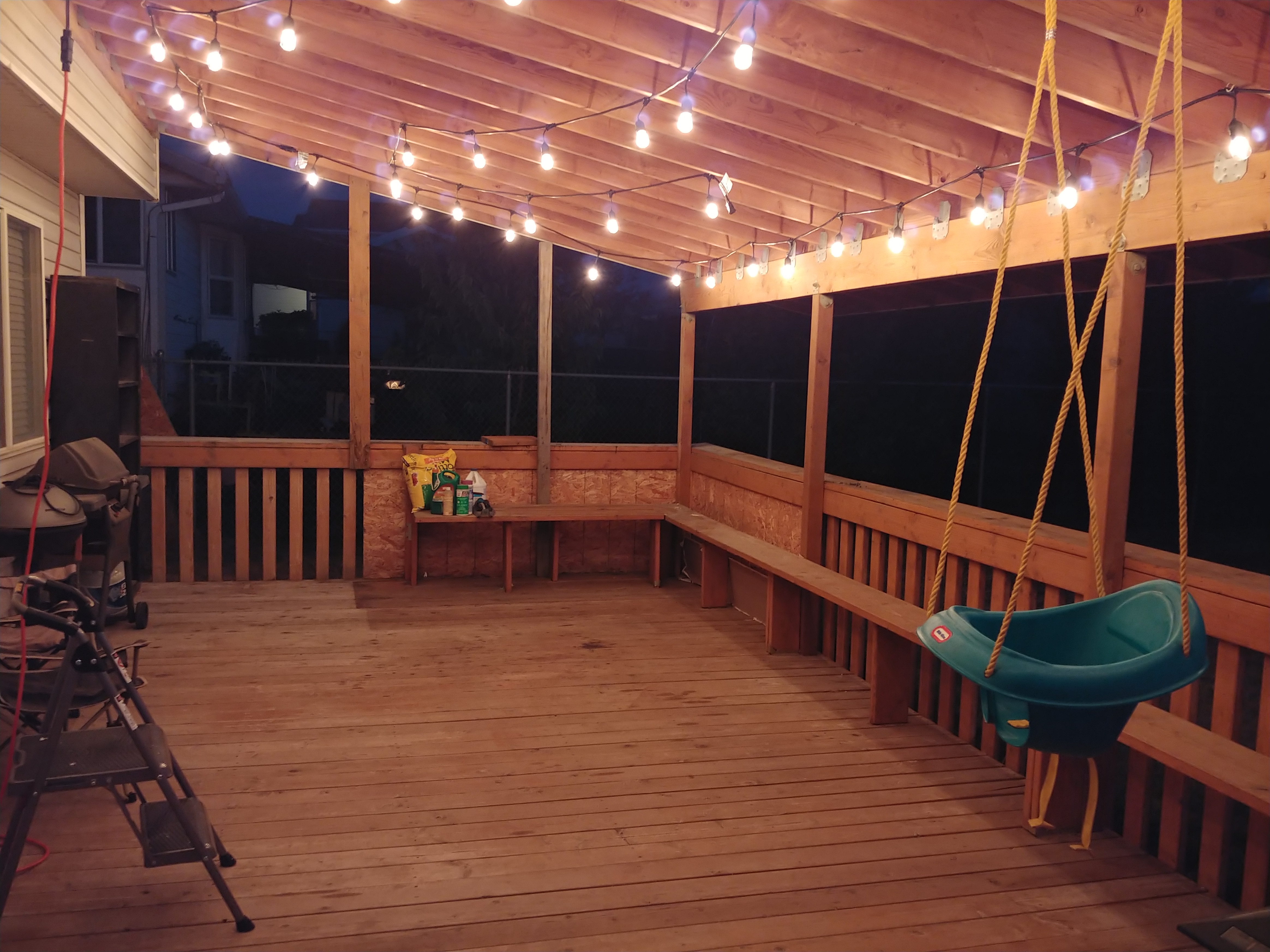 I managed to get the lights up within the week, and now the deck is a rather nice place to be in the evening. You can grill, play a game, hang out, or whatever. If my hot tub were still operable, that might be fun to do as well. Just another thing to add to the list of improvements that need to be made.