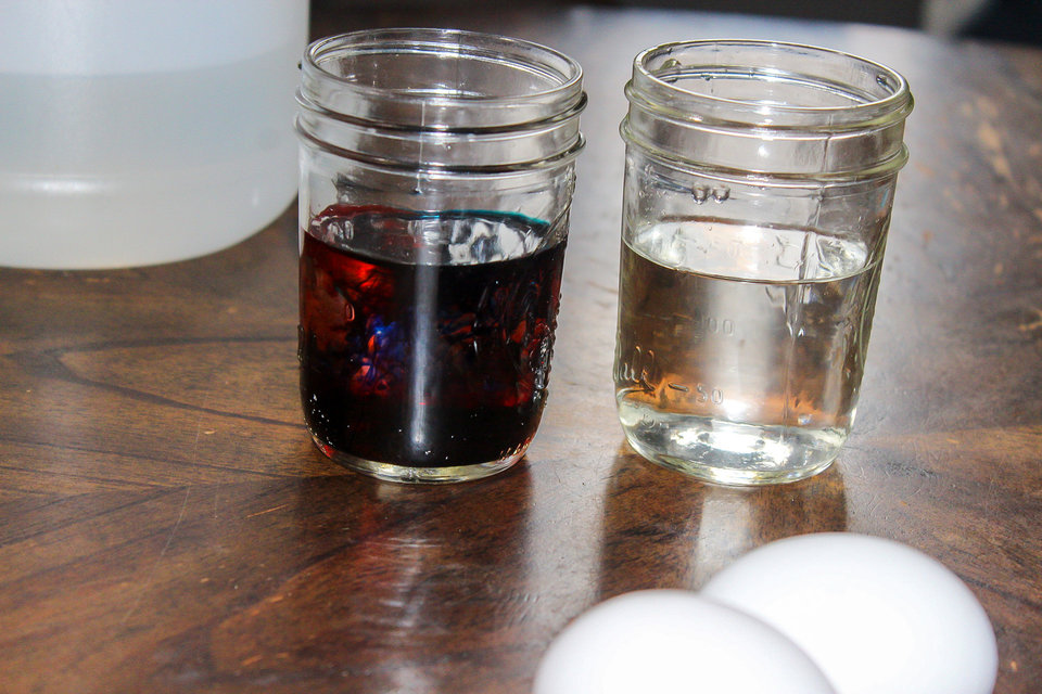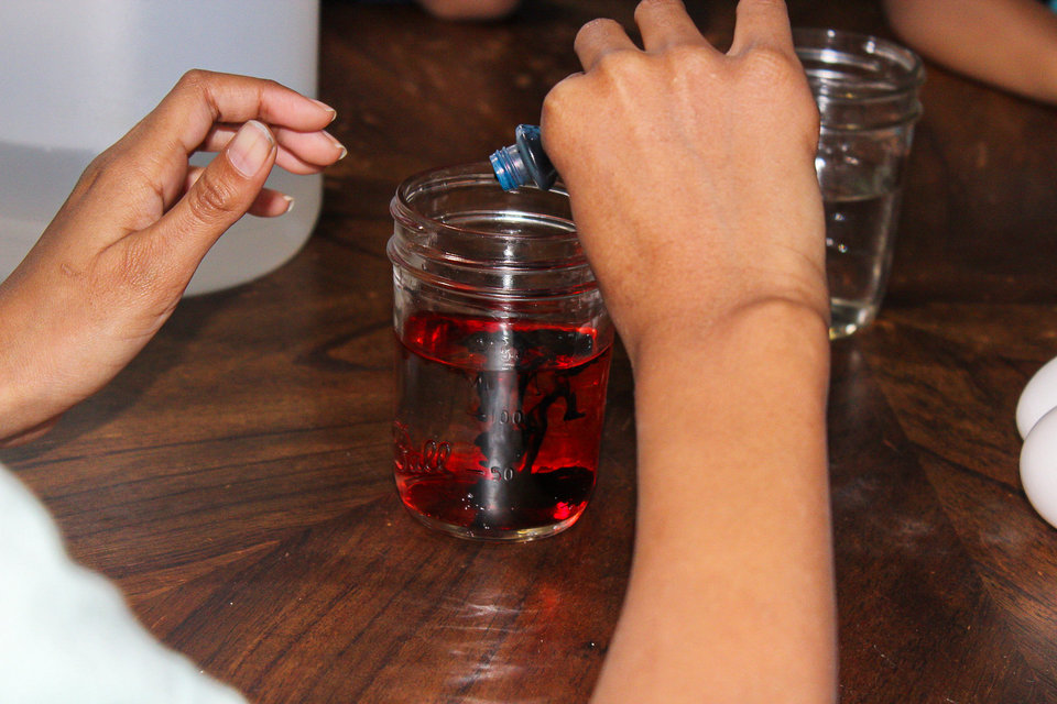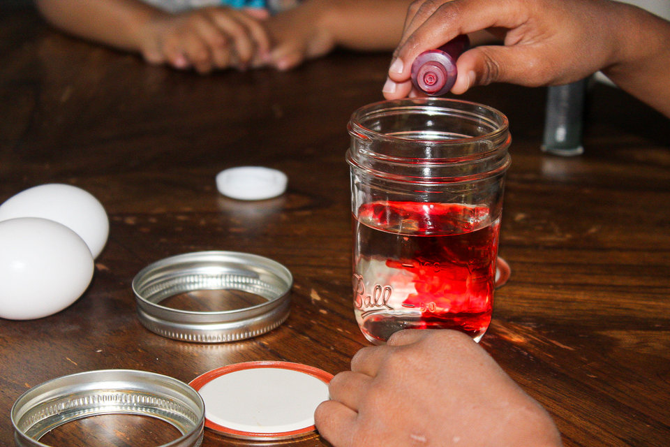 First we filled each jar half way with vinegar. In one of the jars we added five drops each of blue and red since everyone voted for a purple rubber egg. Carefully place the eggs in the jar and close the lids.