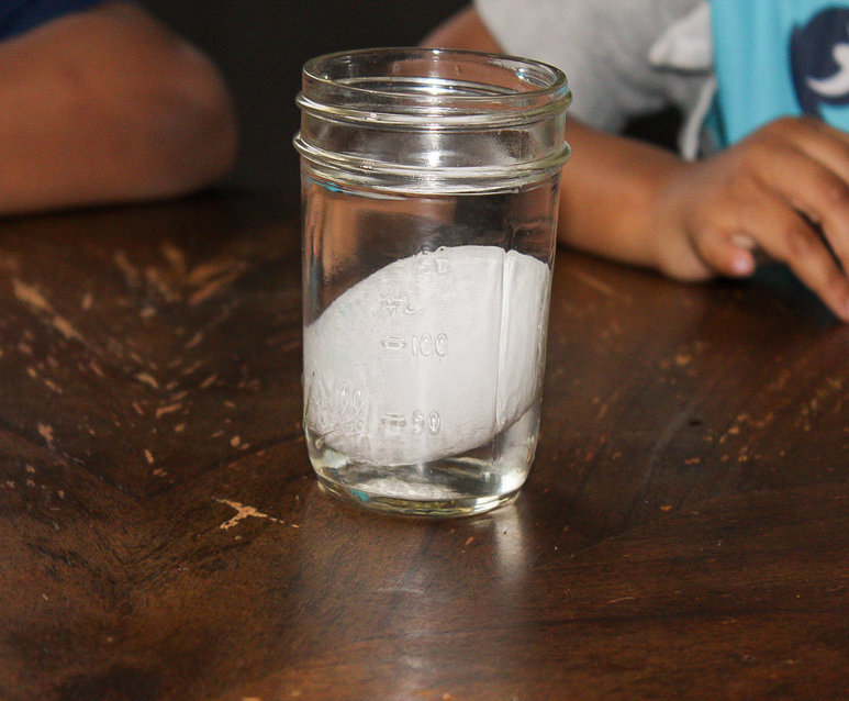 We could definitely see the eggs had enlarged! Vinegar also causes the eggs to expand as they sit. Those bubbles you see are a chemical reaction between the acid in the vinegar and the base in the calcium carbonate of the eggshells. When an acid and a base mix they form the gas carbon dioxide.