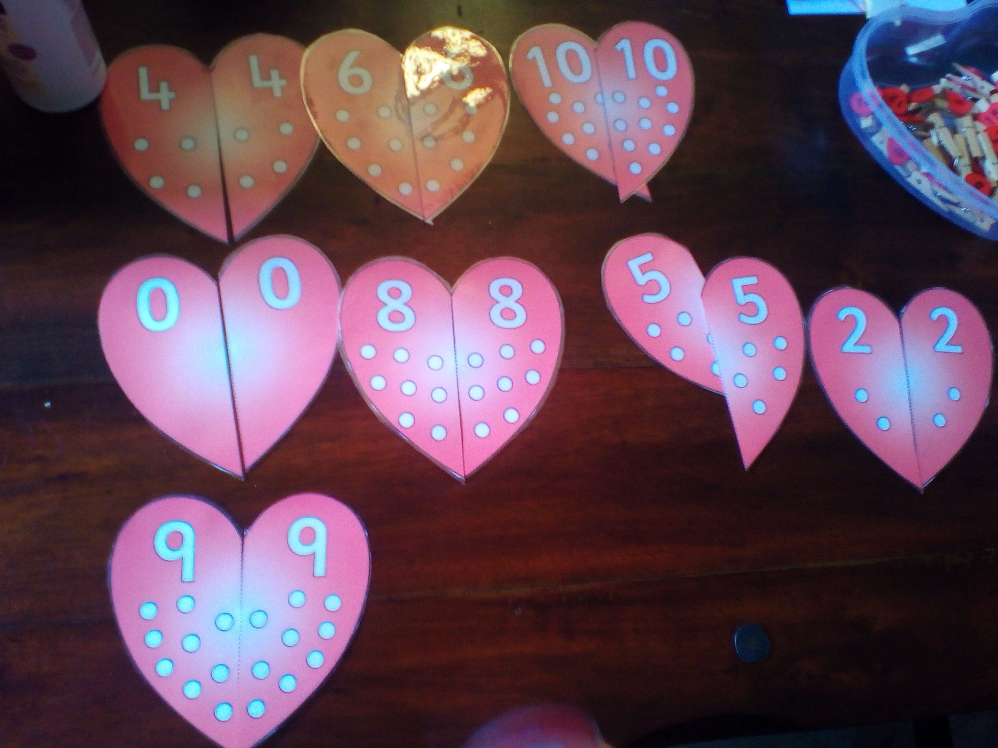 I placed the two halves of the hearts in 2 separate piles and asked ‘Coconut’ to match the hearts with the same numbers. Then asked her to say the sum ie 4+4=8.