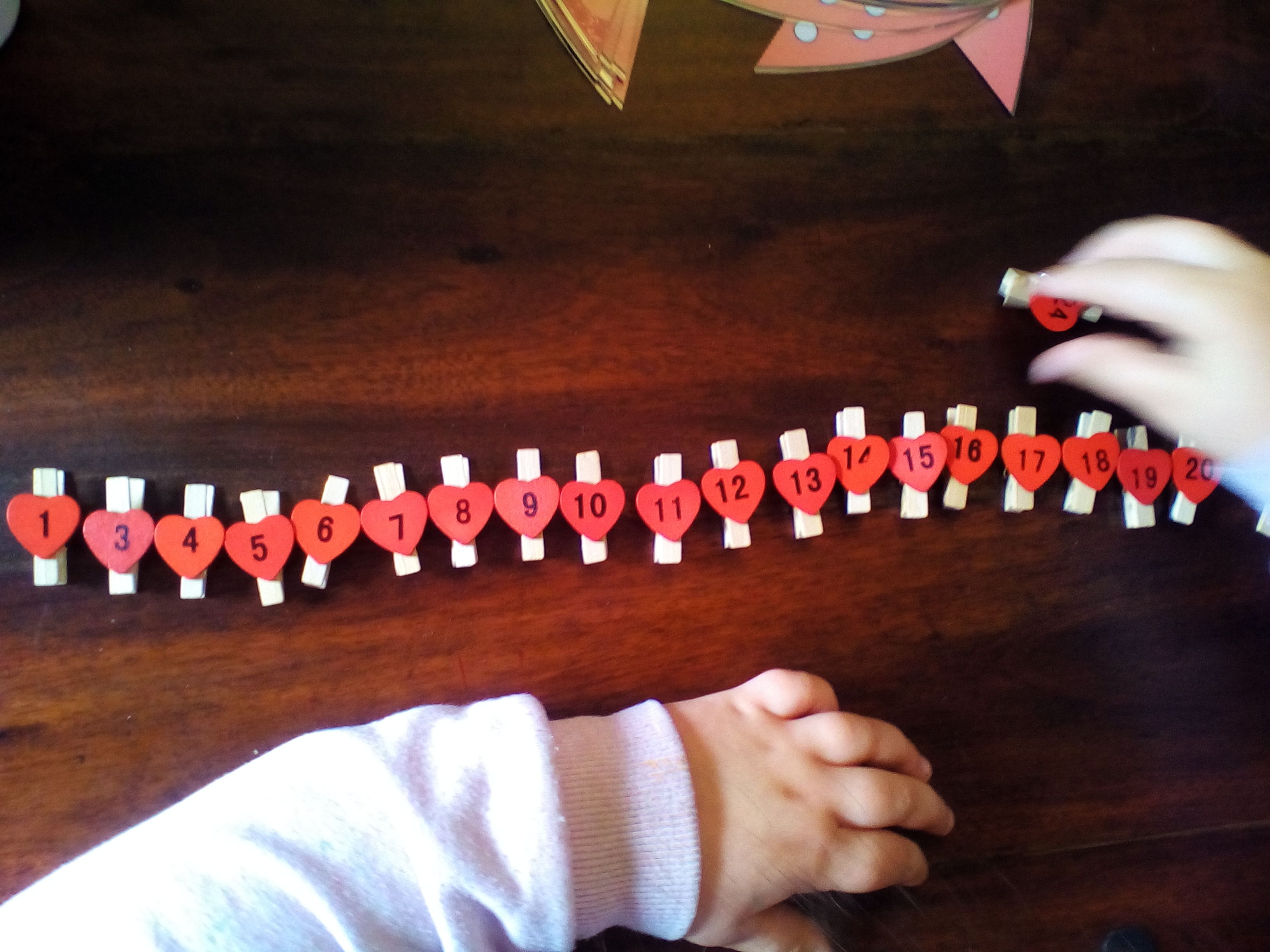 Next I emptied our heart pegs into a heart shaped container and after Coconut explored the pegs I asked her to put them in order from 1 to 24