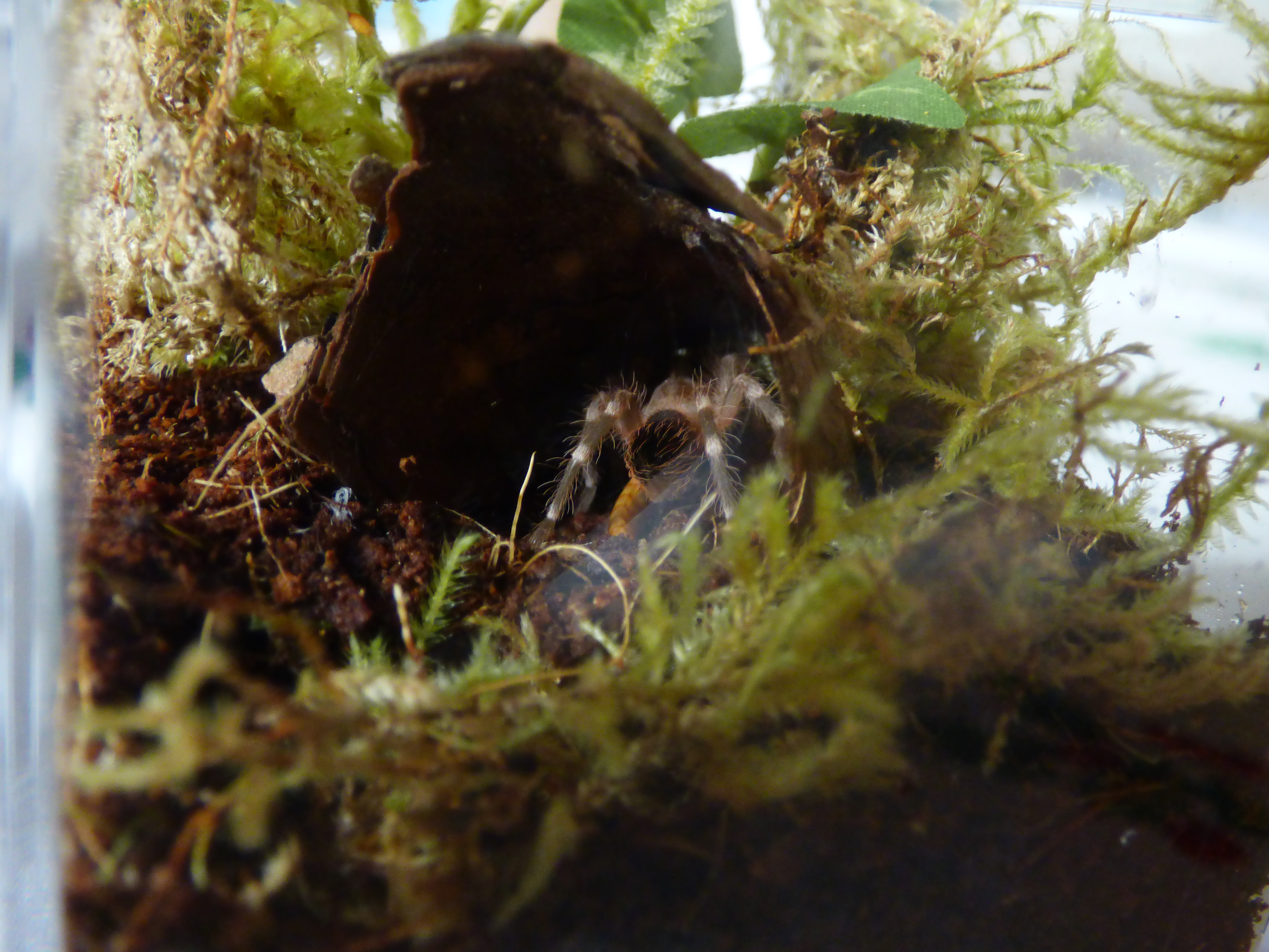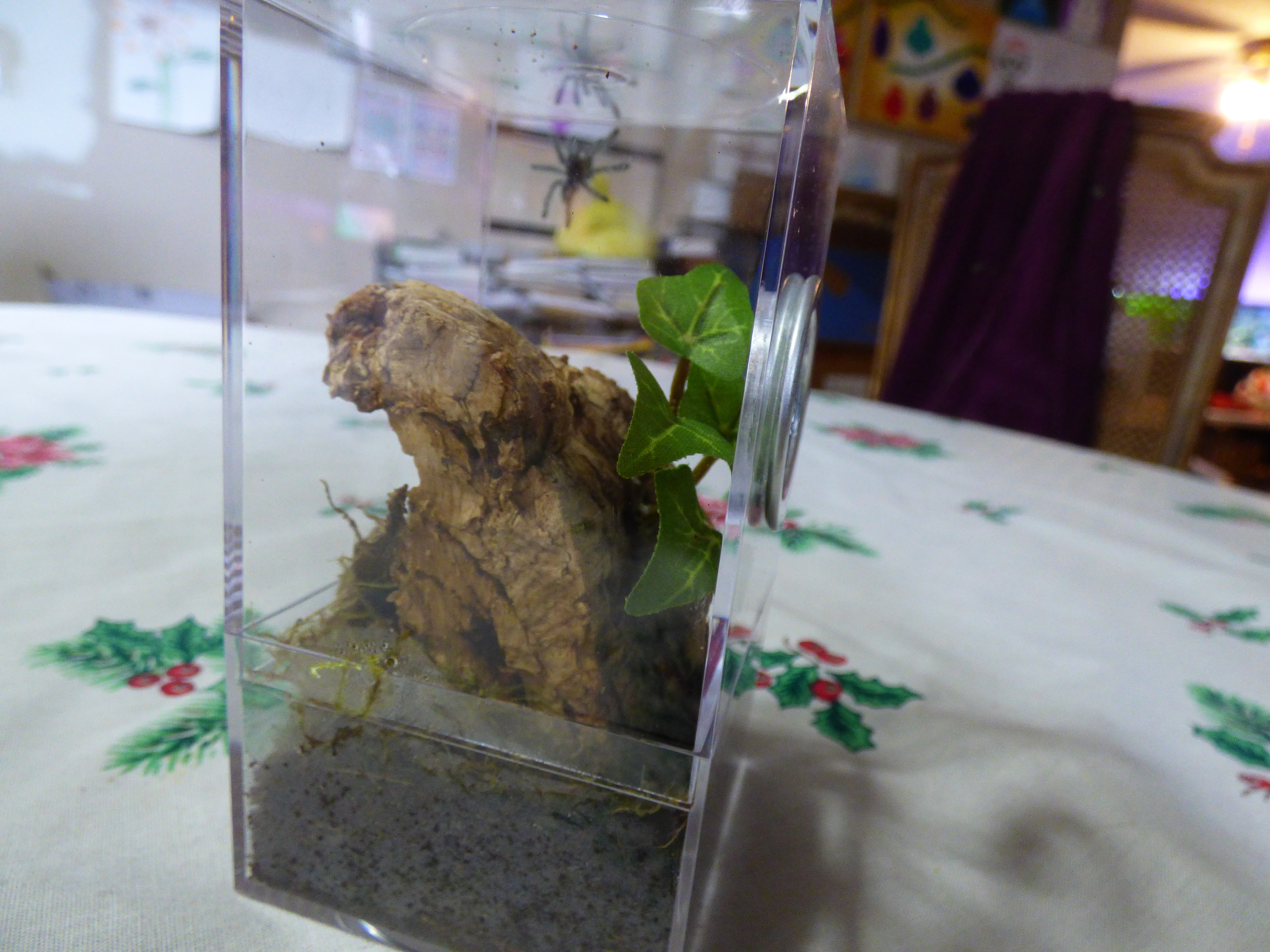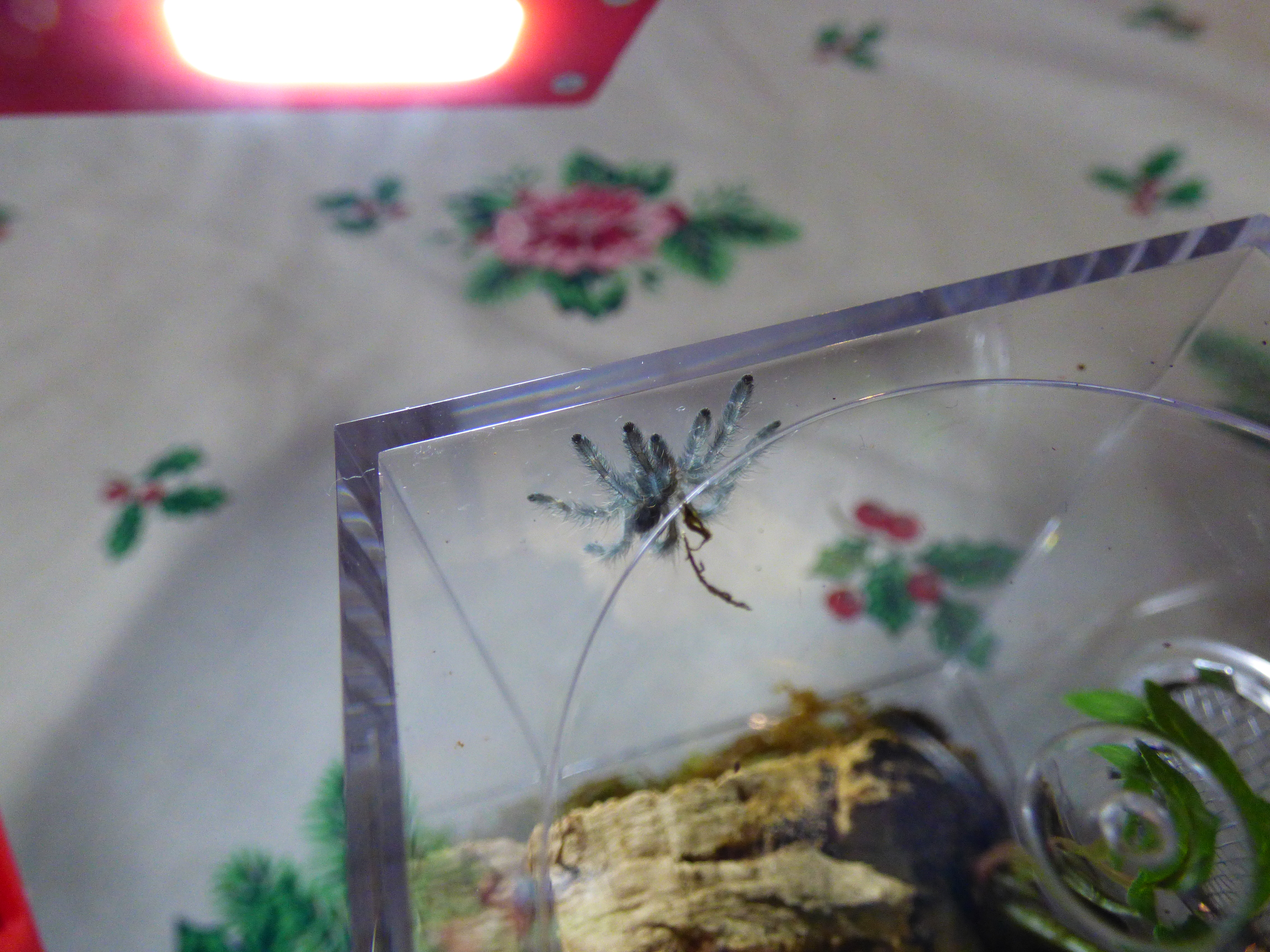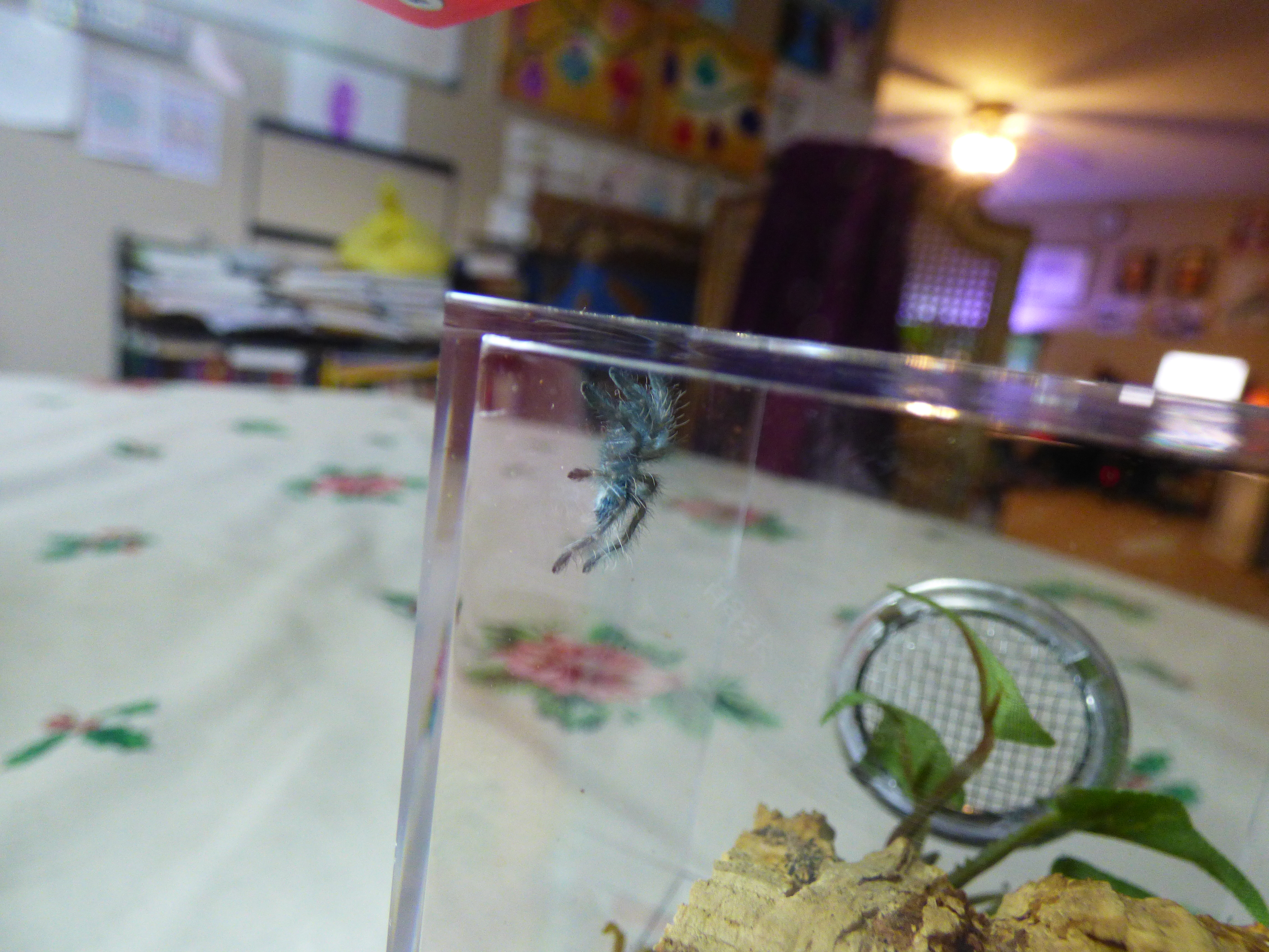 At about mid-day-ish, I decided I wanted to try giving Acanthos a mealworm, I knew he probably wouldn't take it (It's his first day in a new home, after all!), I dropped in a small dead mealworm, and for a minute he did nothing... But just as I was gonna say: "Maybe I should take out the mealworm." He pounced on it! That is when I knew he would be an aggresive eater! 😁 Anyways, SquishySquids T. has been hangin' out on the wall, and mine is still eating.