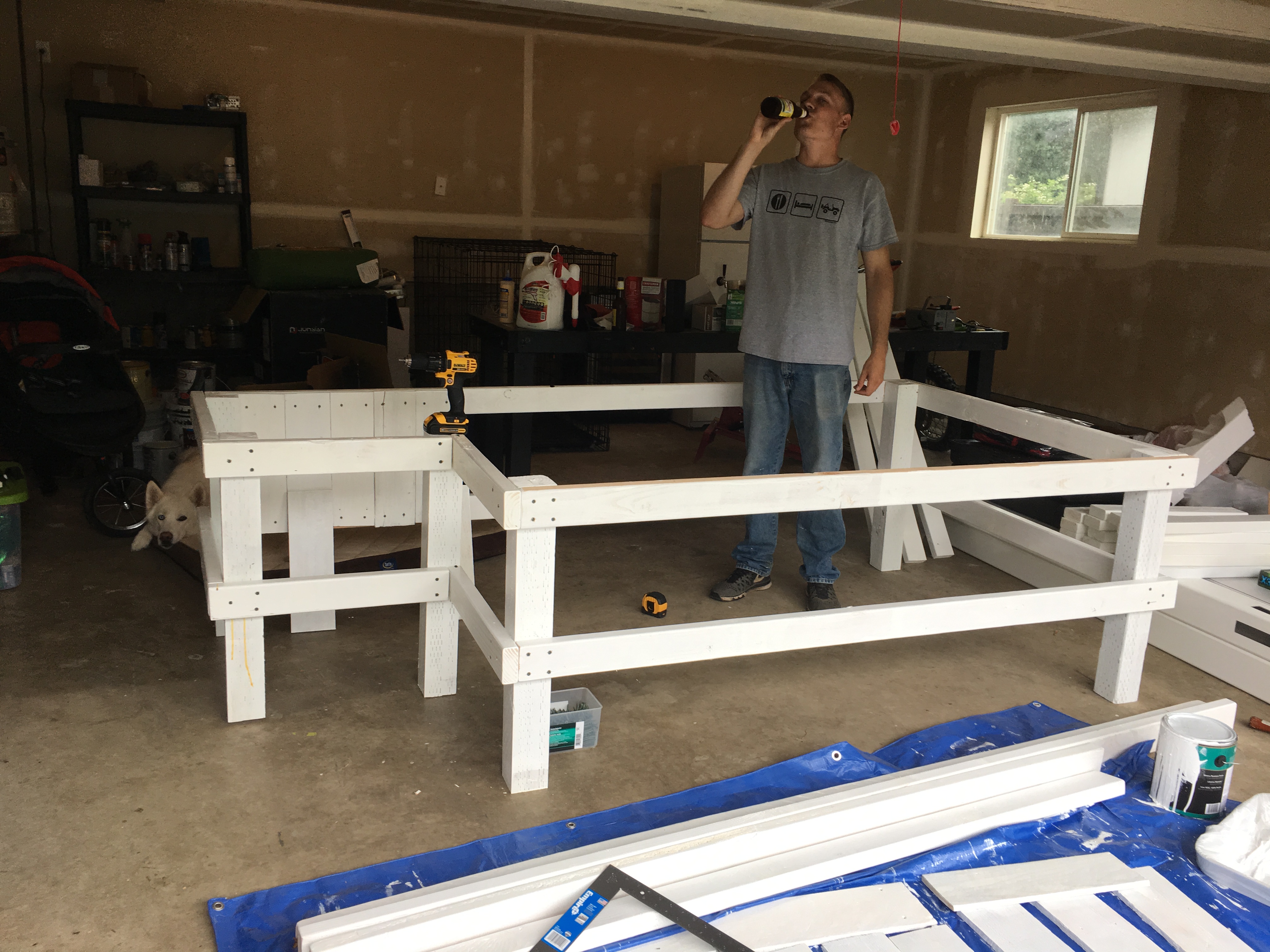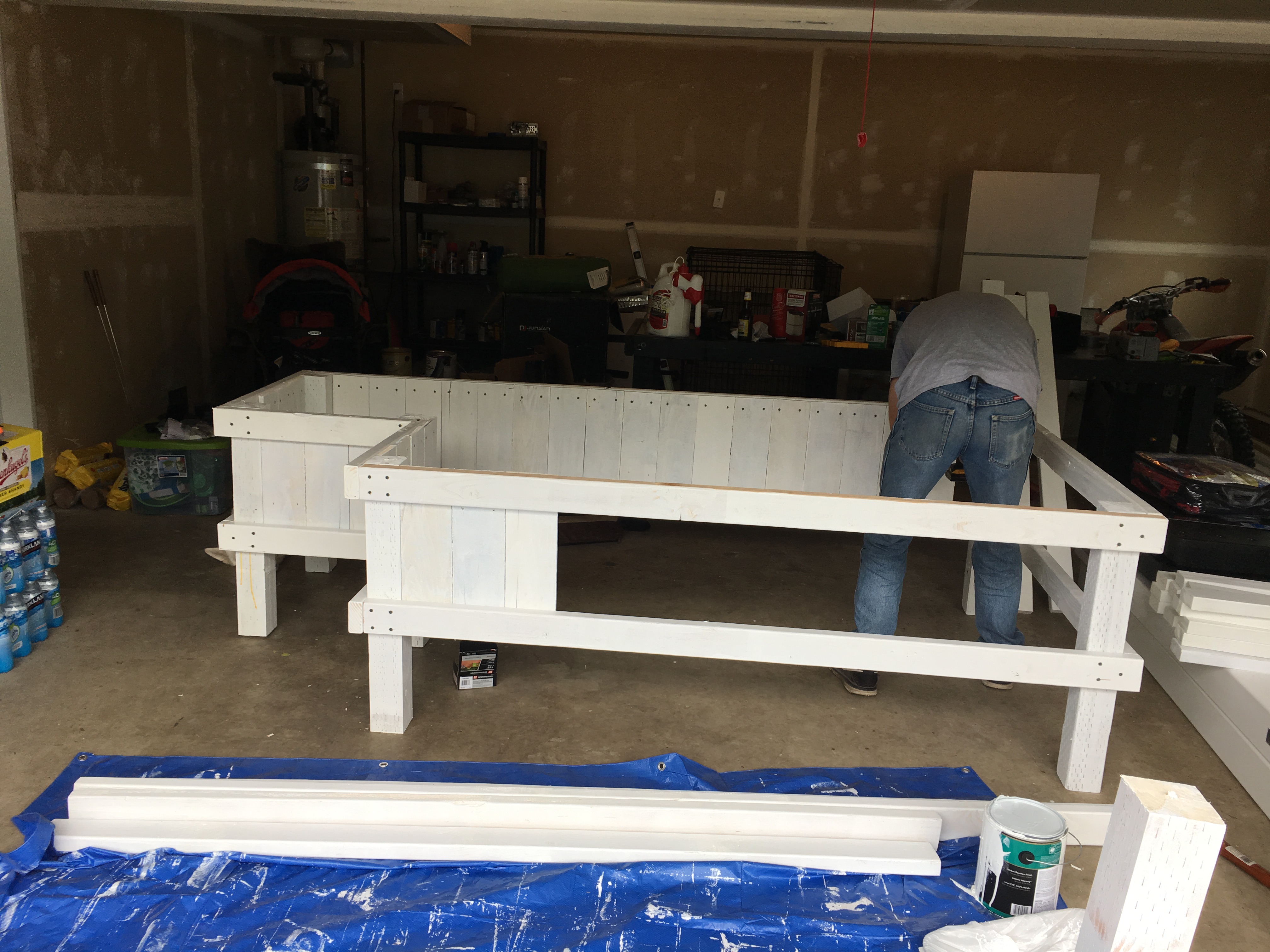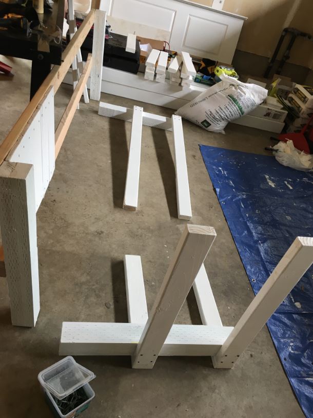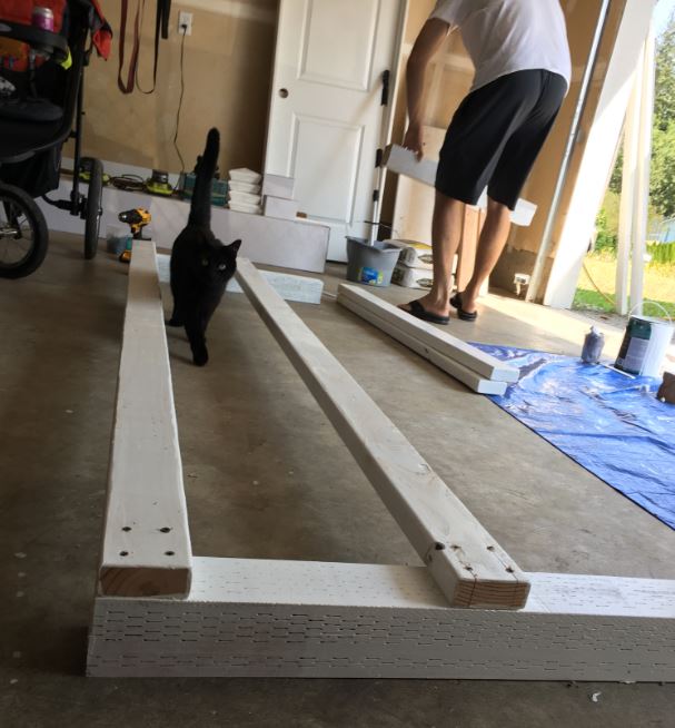 After we knew what we needed, the next step was to gather and prep our materials. For the walls of our planter, we decided to use planks from the fence we were tearing down. A lot of it was dry-rotted, so using a circular saw (please be safe with this one!) we cut out the best pieces into 18” slats. We sanded off the outer layer of old paint, wiped each piece with a damp rag to get the dust off, and used a white exterior primer to prime all sides and prevent future water damage. We painted at least two coats of primer on each piece! We laid out a tarp and fit as many pieces of wood on it as we could. We also cut 2 x 4 pieces for the frame, and 4 x 4 pieces as posts to eventually dig the planter into the ground. Probably a bit overkill to use 6 posts for each planter, but I ain’t mad! The most important thing here is PRIME, PRIME, PRIME! Water damage is not your friend!