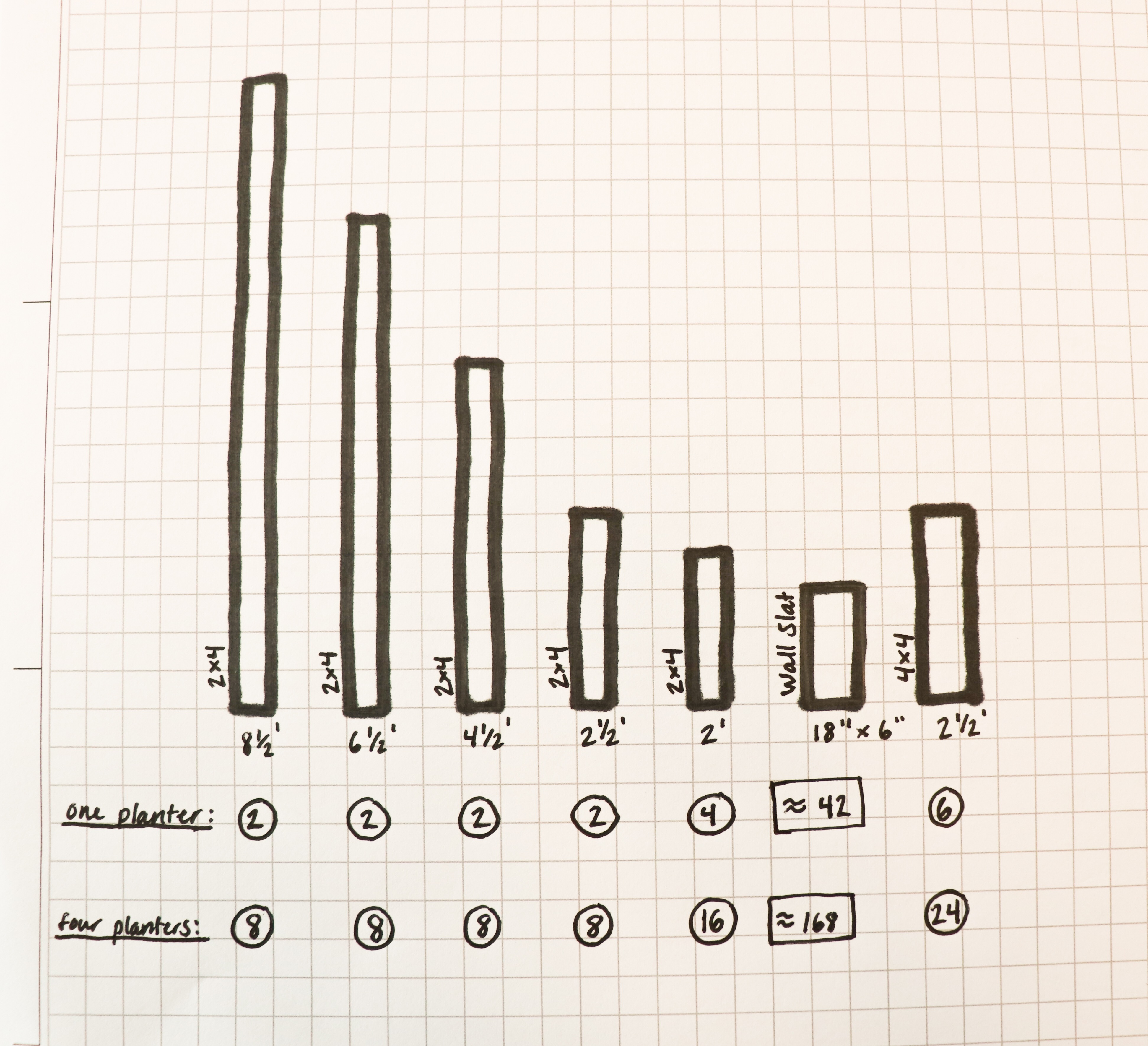 When Tanner and I agreed on our design, we took to researching what materials we would need. This meant quite a few trips to window shop at Home Depot, Craigslist/Online Marketplace searches for free items, and using what we already had around our yard and house. We were extremely fortunate to have a fence surrounding our backyard that was falling apart and needed replacement (trying to be optimistic here!) so we decided to re-purpose the old fence to make our planters. We also searched Craigslist for “free wood pieces” here and there. We ended up purchasing 2 x 4’s and 4 x 4’s from Home Depot because we wanted new, stable pieces for the frame. I am weird and I love crunching numbers, so I used our sketch and a tape measure to calculate exactly how much lumber we needed for all of our planters. Note – Every planter is unique and different. Below are approximations of what we used for one planter, and we built four planters all together. This is just an example of what worked for us!