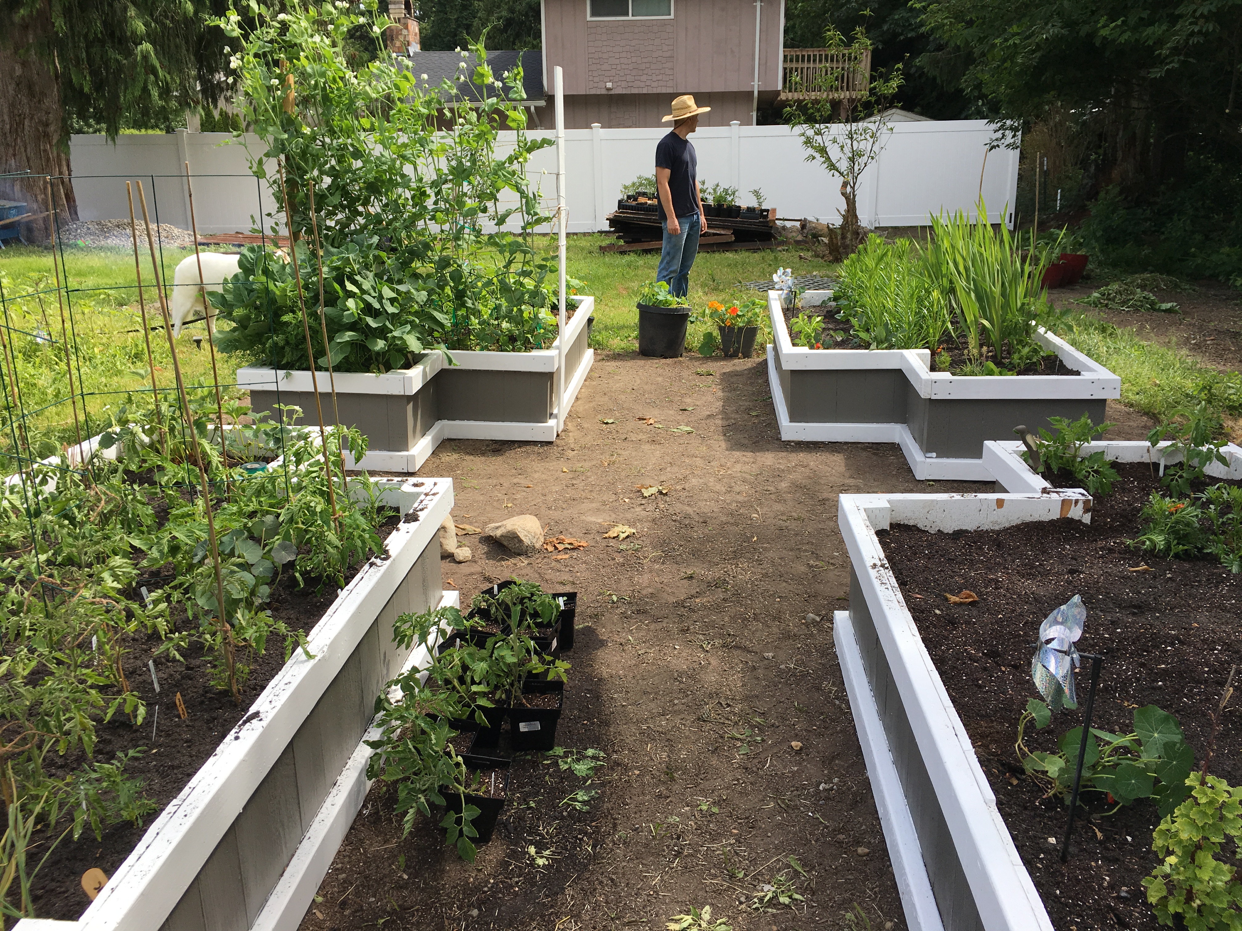 We set up taught, pink, construction string around the perimeter of the entire garden area, using the first planter as the cornerstone to make sure the remaining 3 planters were placed in line with one another. This part took a lot of re-digging and shifting planters to get them just right! We also used a rock rake to make sure the ground below the planters was level, and filled little dips and holes as needed.