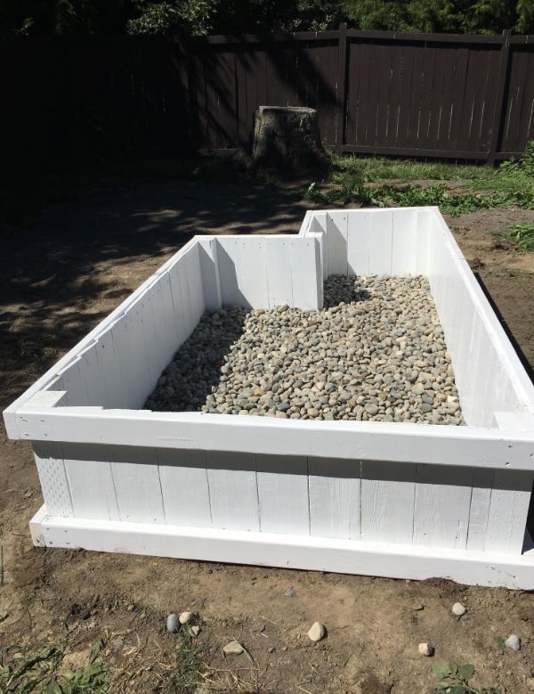 Okay, so here’s the thing about raised planters: proper drainage is important. If it rains, you don’t want to end up with a giant mushy mud pond where your plants are supposed to be. We picked up some free gravel and drain rock from Craigslist and ended up purchasing a bit more, and put approximately 3-4” of this rock and gravel at the bottom of each planter box. This gives extra water a bit more space and places to go so it doesn’t drown out your plants. We did not line the bottom with landscaping paper or cardboard, because we wanted our planters to be able to drain well in the rainy months.