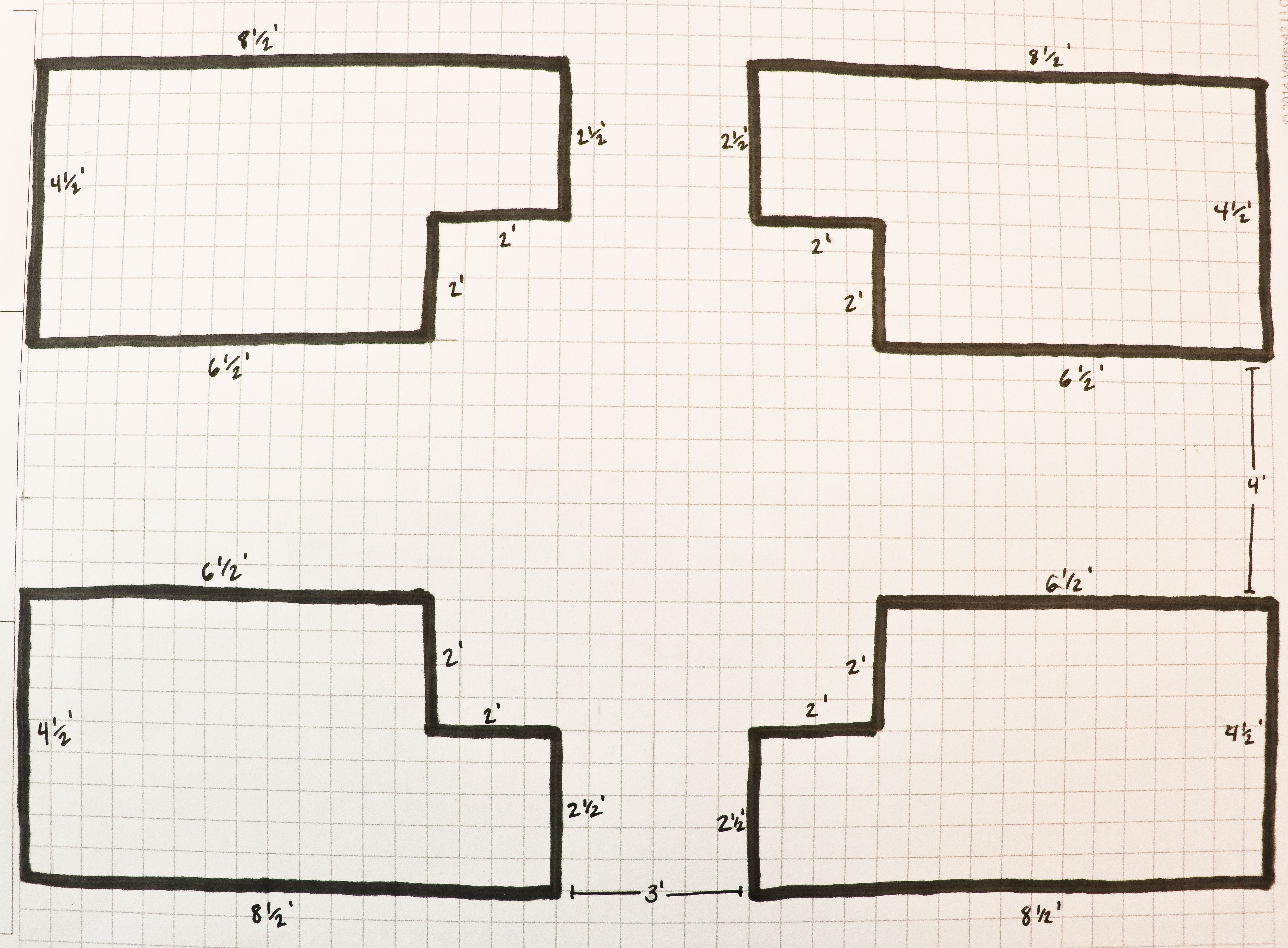 We had a 20’ x 13’ area where we wanted to build, so I drew out a 20’ x 13’ scale to size box on graph paper so I could plan the shapes of my boxes. I printed out some printable graph paper from google and got started!