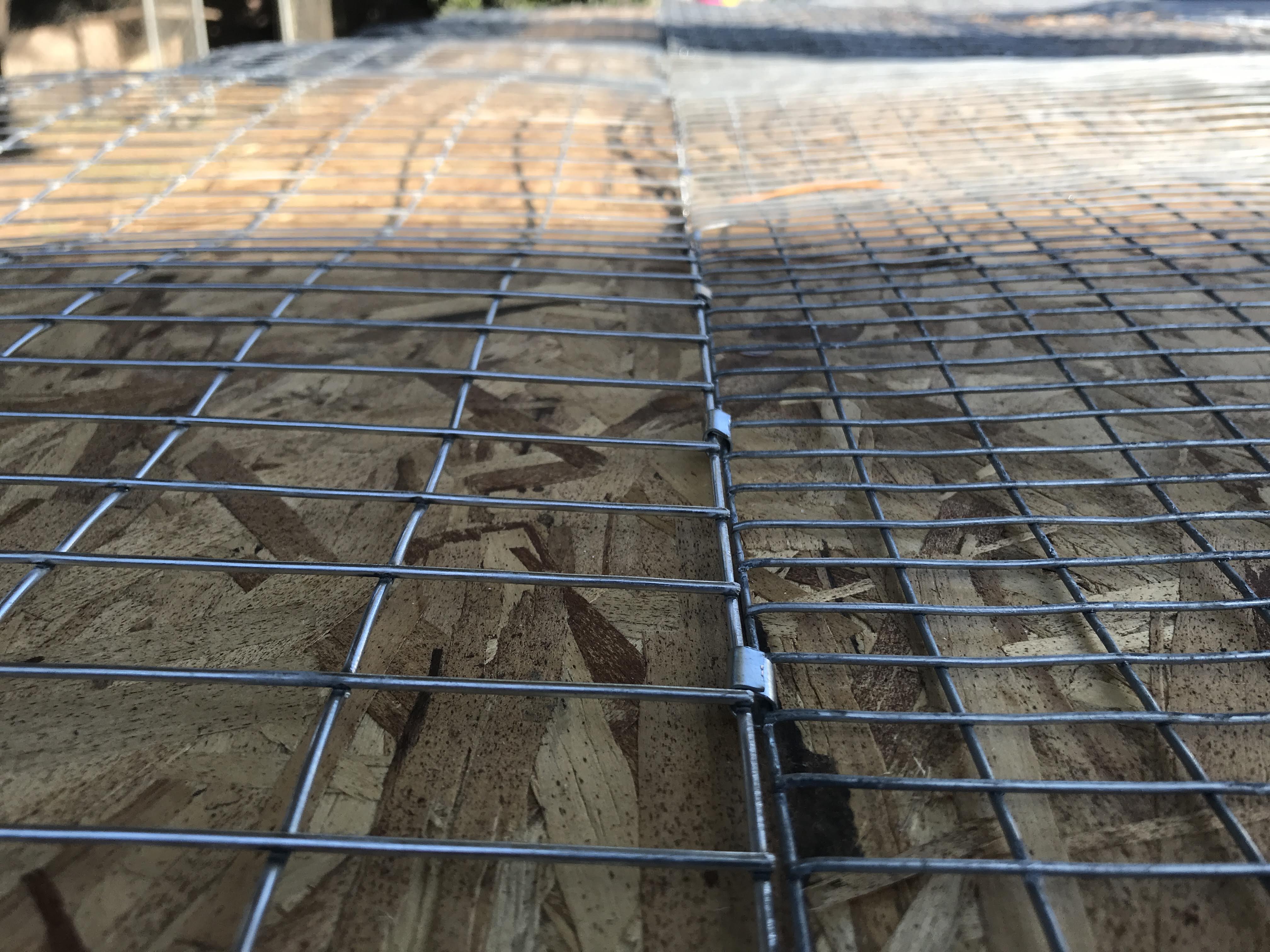 First we cut all the pieces. The floor will be used as-is, but we need to cut a section of the larger wire to length to make the sides, then cut it lengthwise. I purchased 36" wide mesh, but only want the cages 18" tall. I forgot to account for the wire spacing being 2" in this direction, so the cages ended up only being 16" tall... I'm just going to order 18 or 24" wire for the sides next time...