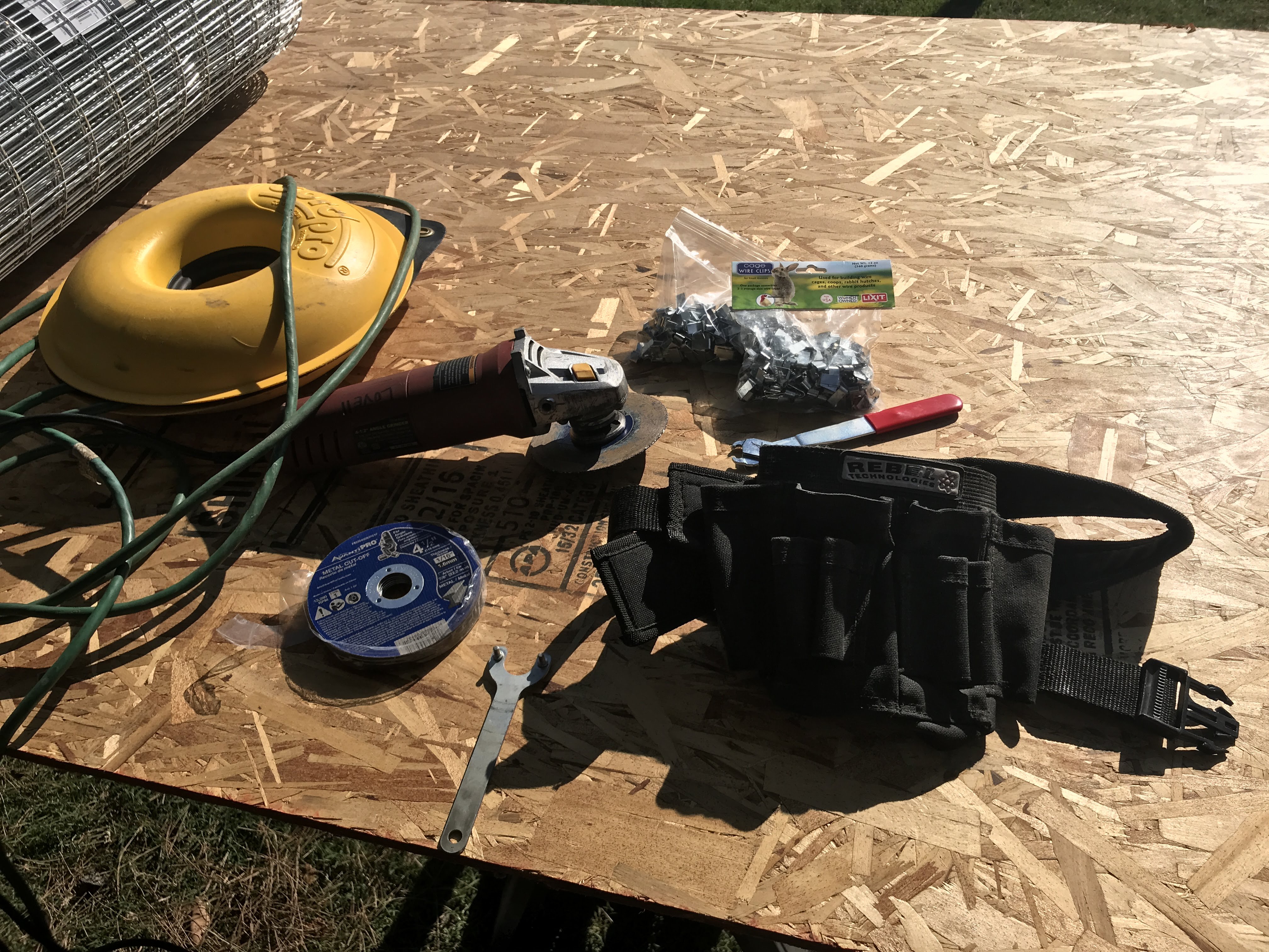 Next is gathering all the tools. lineman pliers (not shown), angle grinder with cut off disks, extension cord, tool belt, and J-Clips with J-clip pliers for joining all the pieces together.