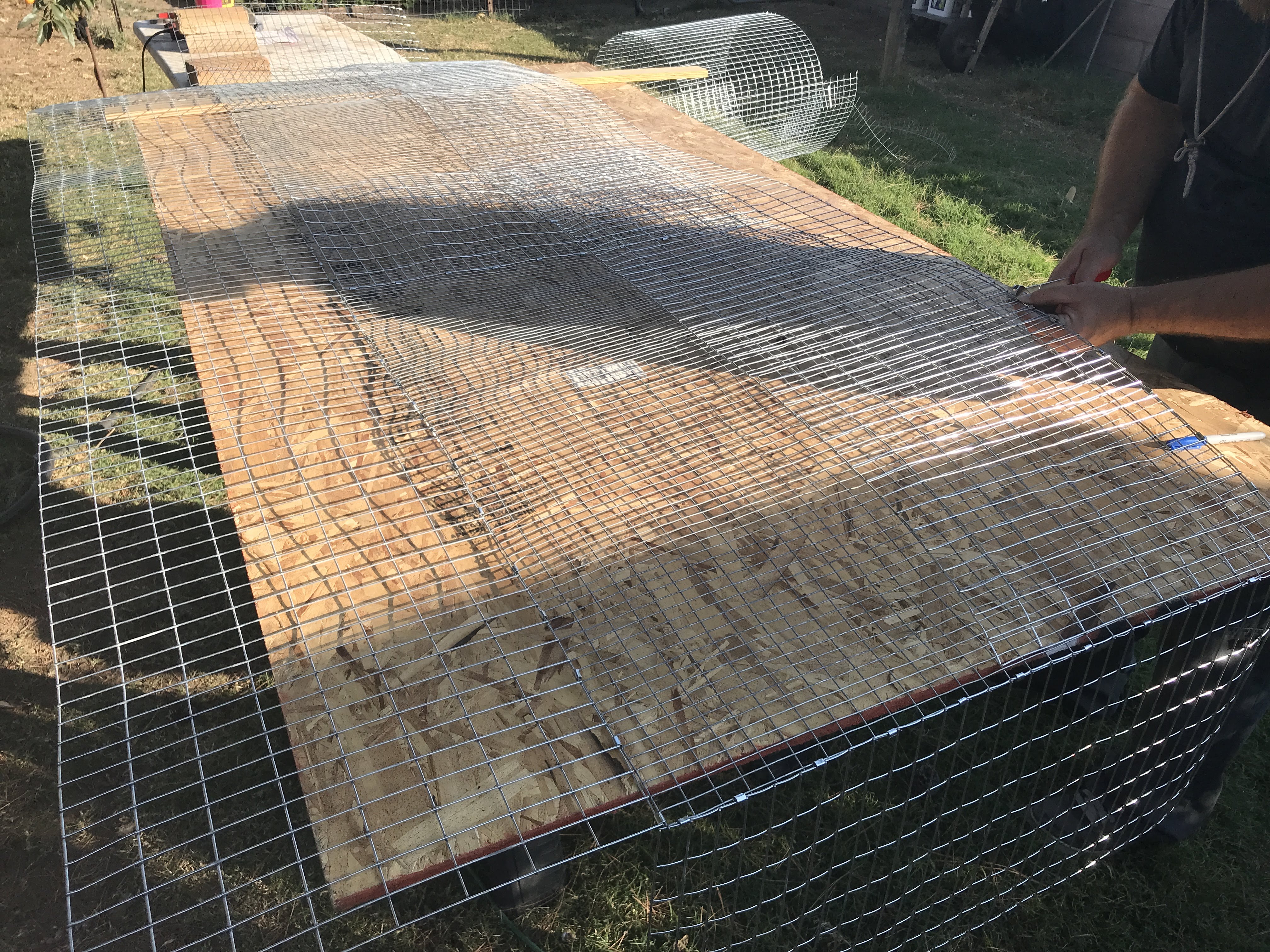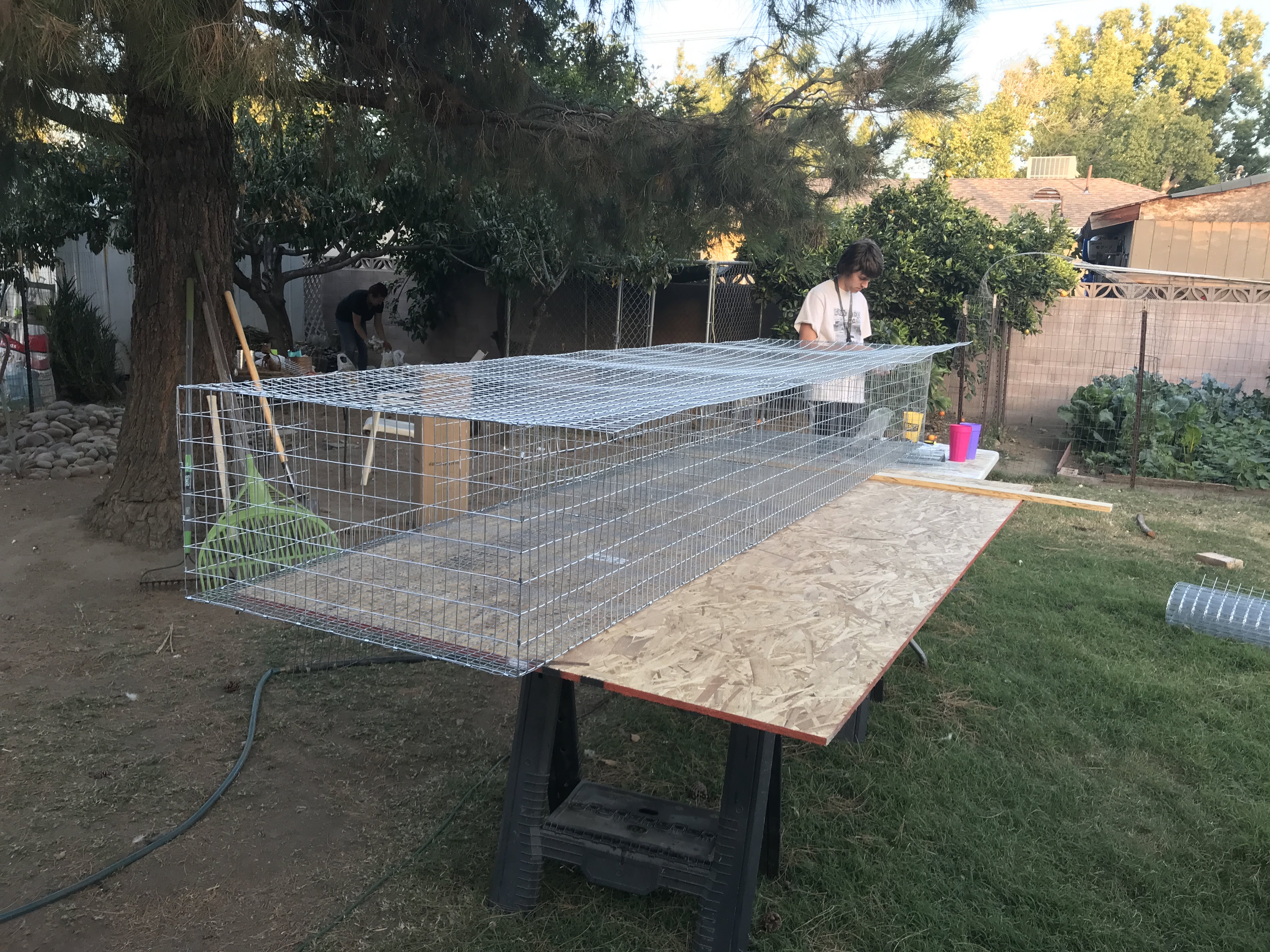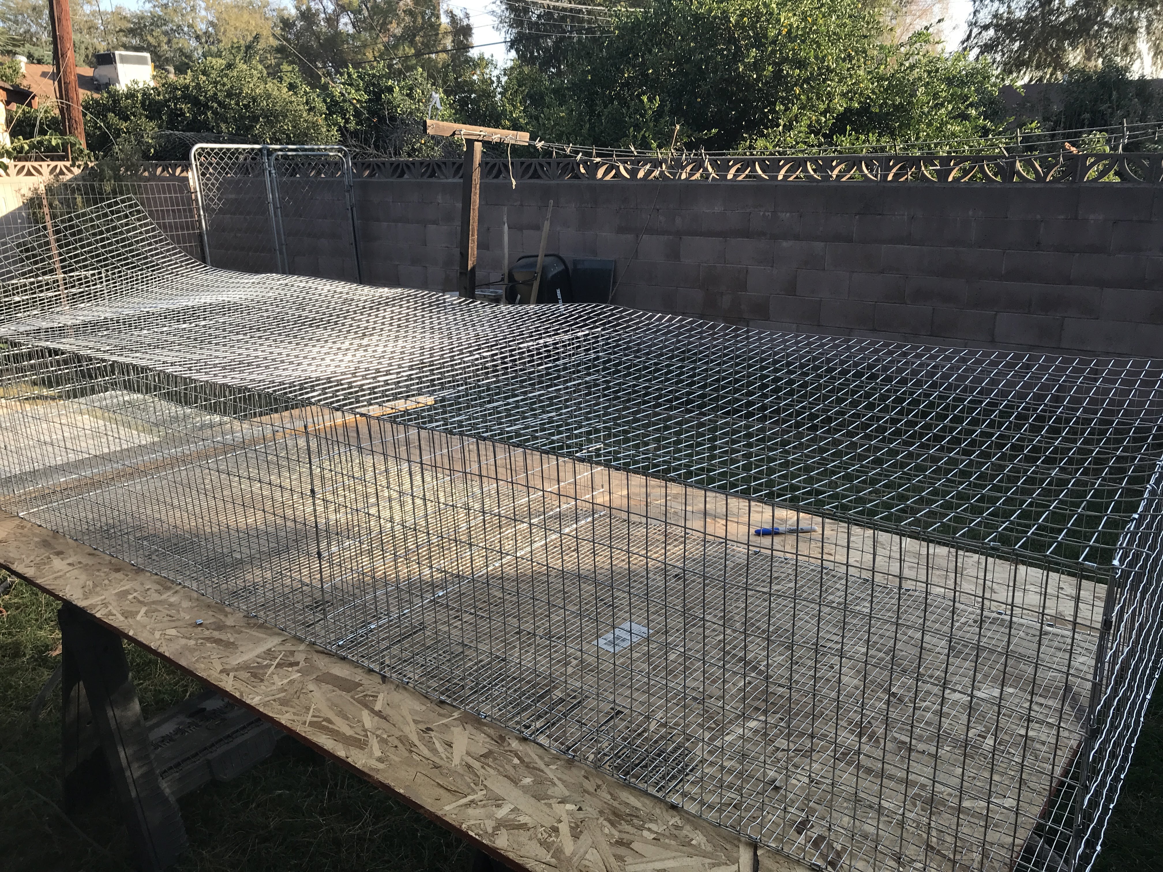 The cage will be suspended from a metal frame. The frame will hold shade cloth over them in the summer to keep them cool, and a tarp over them in the winter to keep them dry (for the couple of days it rains here in Southern California).