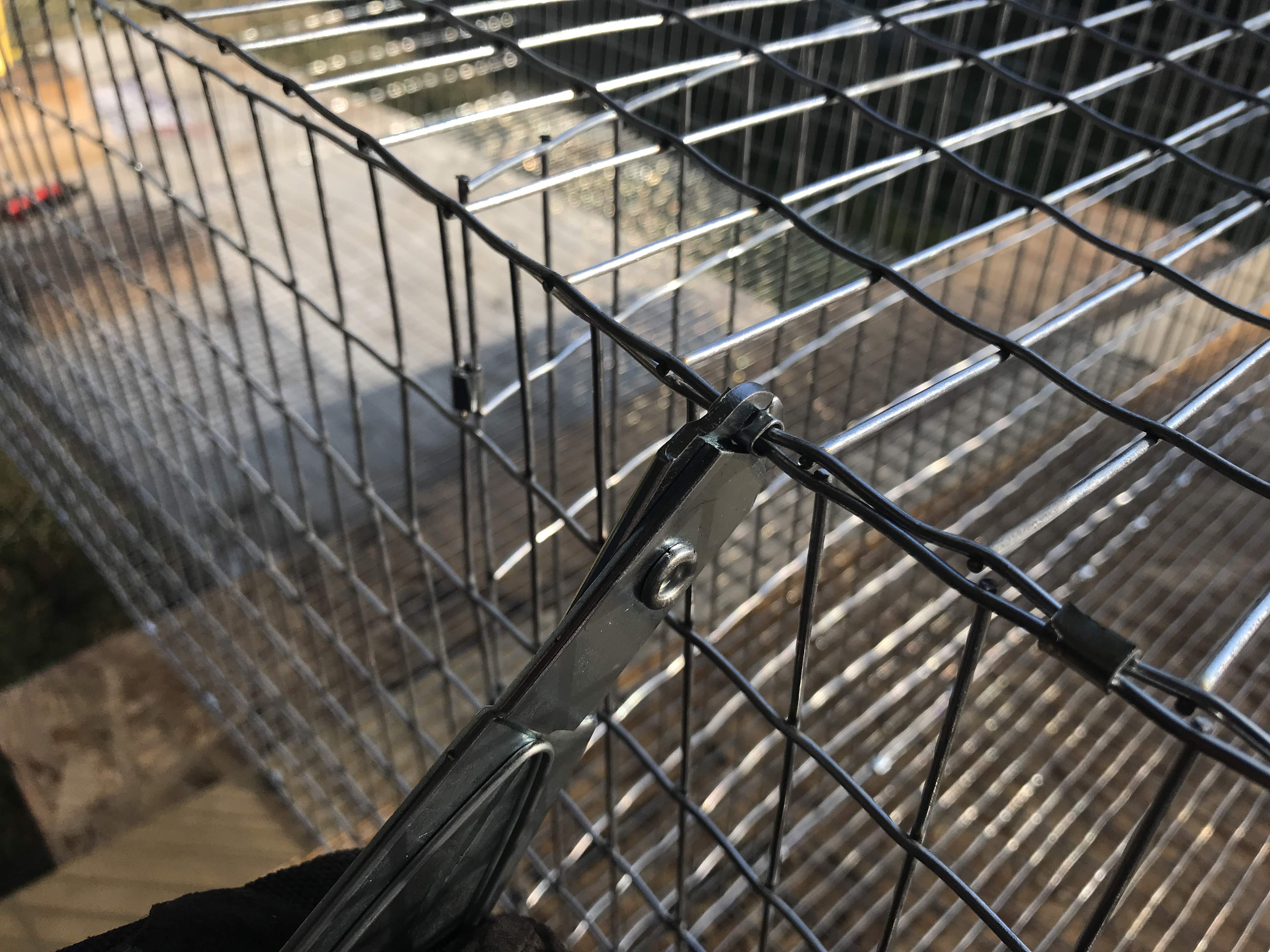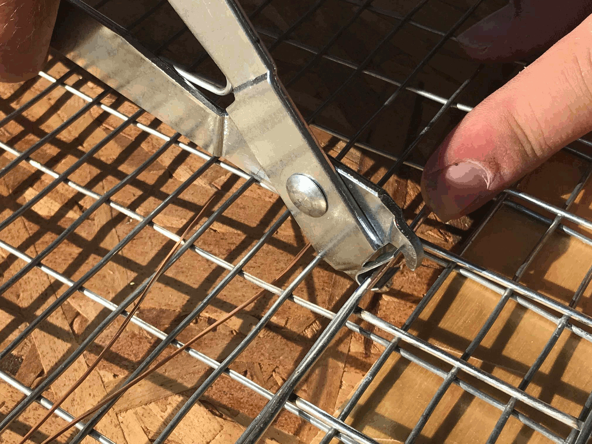 With all the edges free from sharp pokes and burrs, its time to start assembling the cages. All the pices will be joined using 'J-Clips'. you can see blow how the J shaped metal clip wraps around the cage wire and firmly fixed the two pieces together.