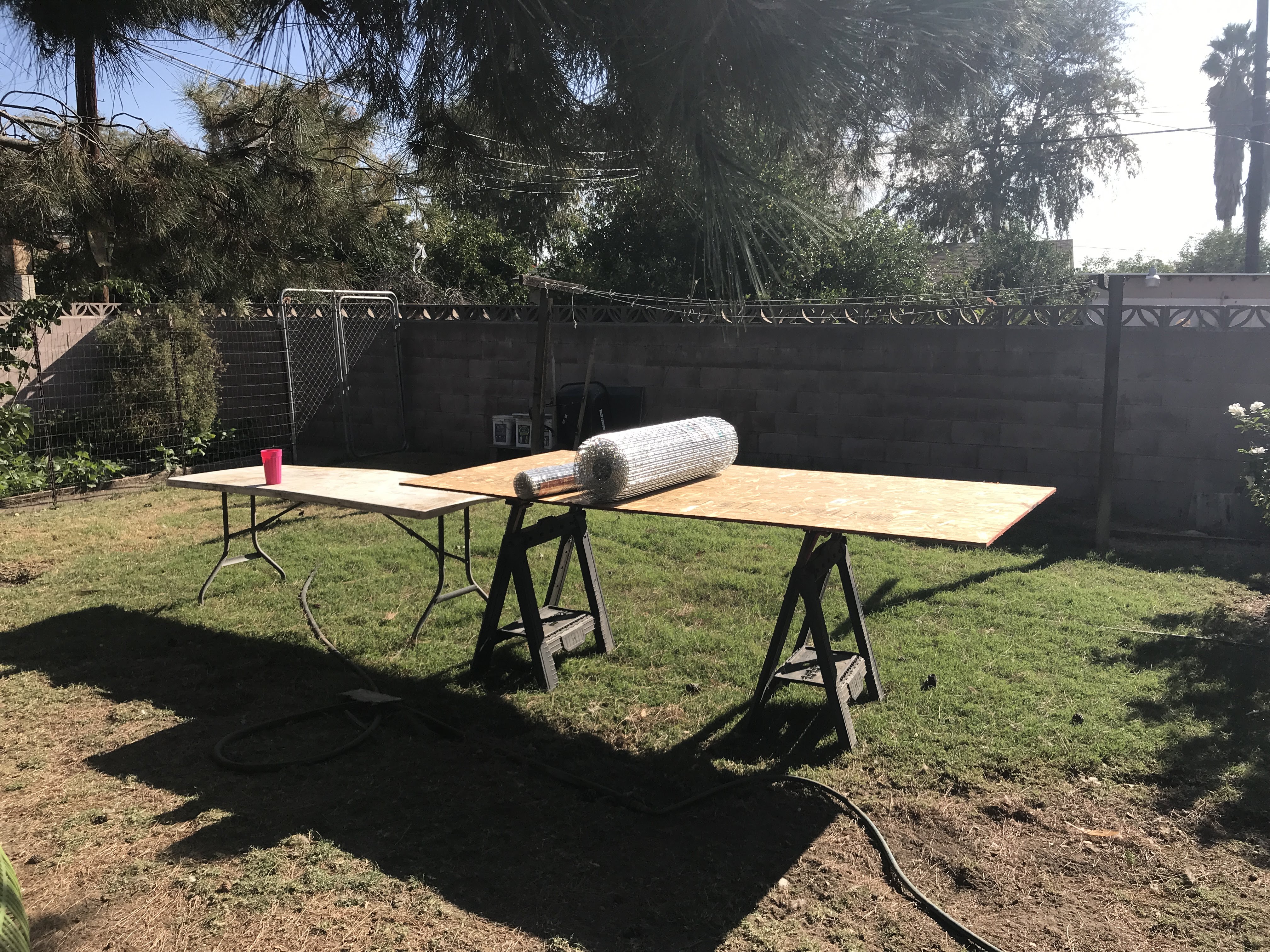 We started by laying out all the materials: a 10 foot roll of 1/2"x1" welded wire for the floor, and a 50 foot roll of 1"x2" welded wire for the sides and top. a large piece of OSB on a couple of saw horses and a folding table will make up our work surface today... Oh, and a large glass of ice water. It might be mid November, but this is So Cal, and its sunny and 78f today!