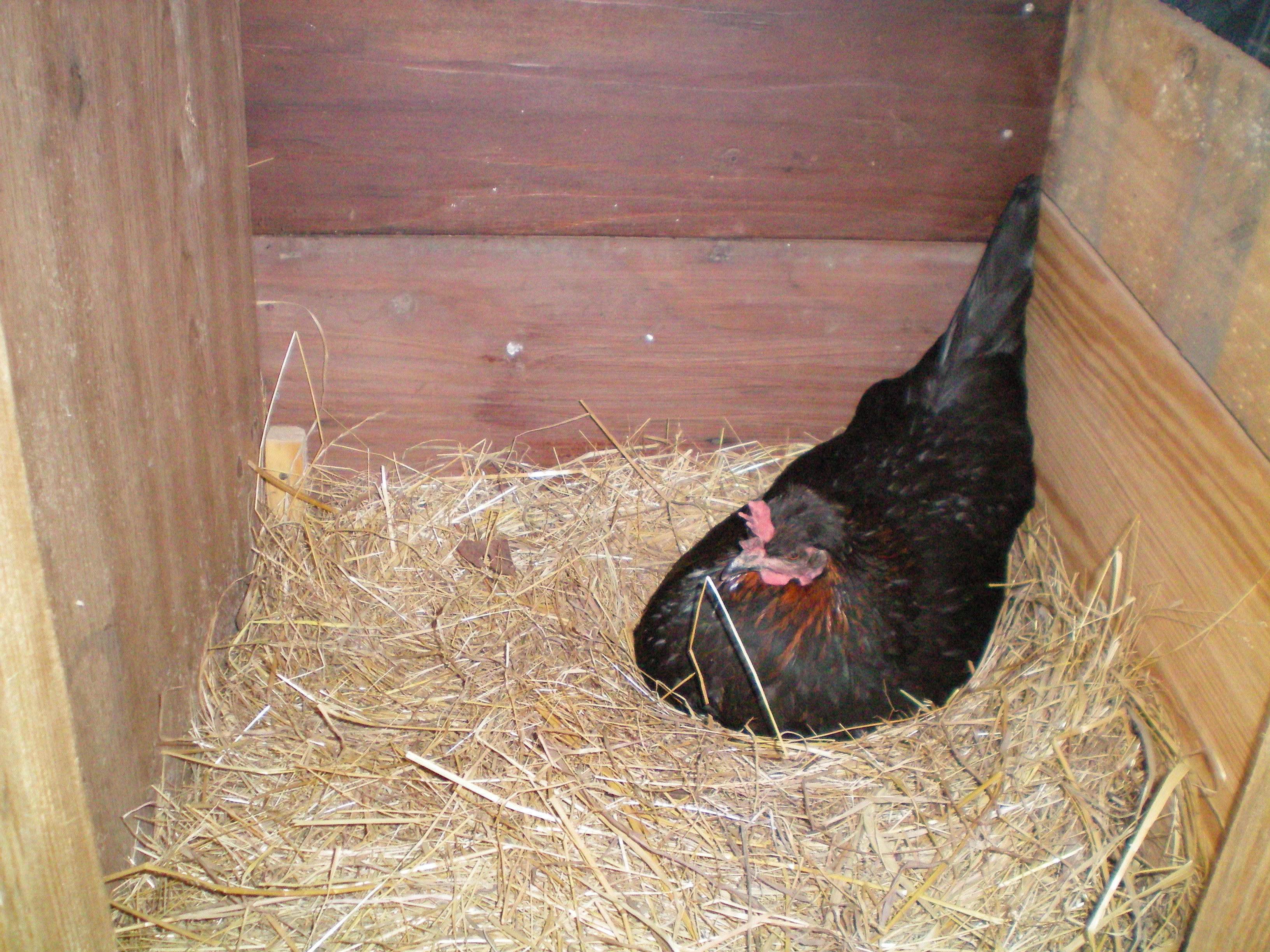 This picture is the last remaining hen from the 4 that were here when I moved. I call her #2, and she is broody right now so I'll have more baby chicks in about 18 days I hope.