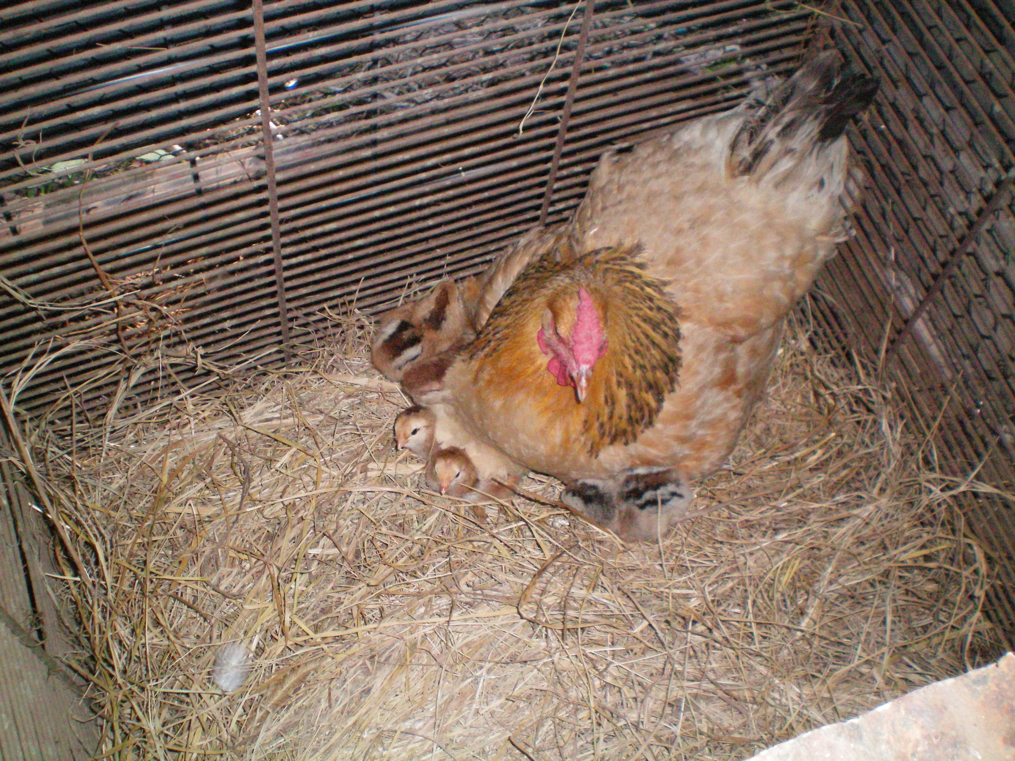 They are in a small cage in the coop for now, but today I threw together a brooder where the mother can raise those chicks until they are big enough to join the flock.