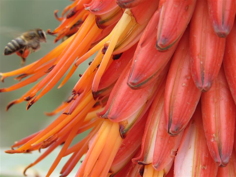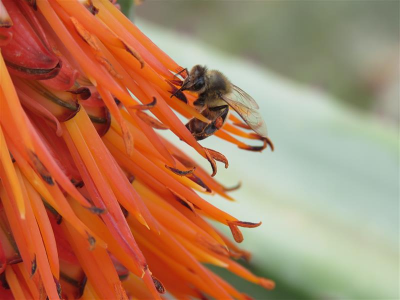 Winter is always special when it comes with colour!!! I hate a drab grey winter. When I lived in the US, Fall was my favourite time of year, with its vivid autumn colouring before the drab grey of winter. Although with the arrival of chilly and depressing winter it usually wasn't long before the snow fell heavily. Then the world was transformed an exquisite white! That snow frosted cover made everything look cozy and ready to be rainbow painted in Spring! Here in our South African corner of the winter world the aloes bloom through winter. It is BEE-AUTIFUL!!