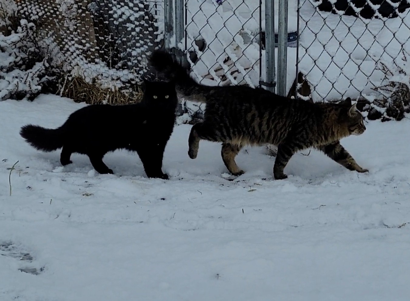 The barn cats seemed unfazed by their first time in snow.