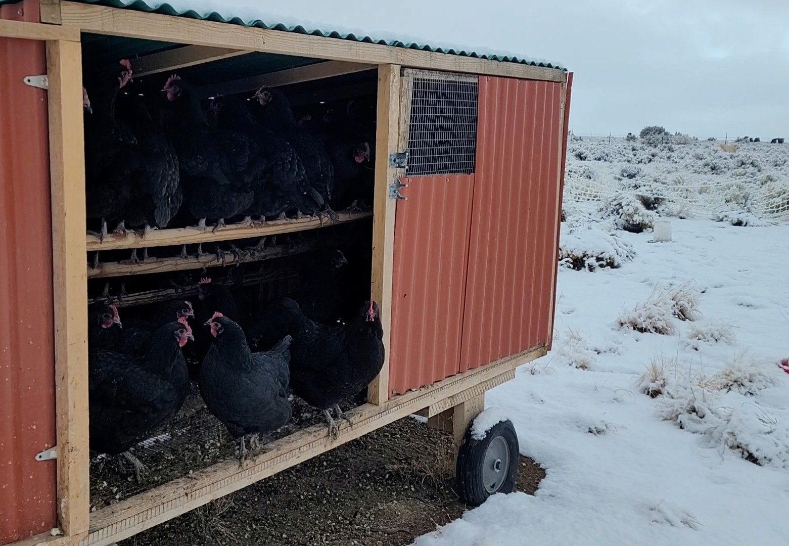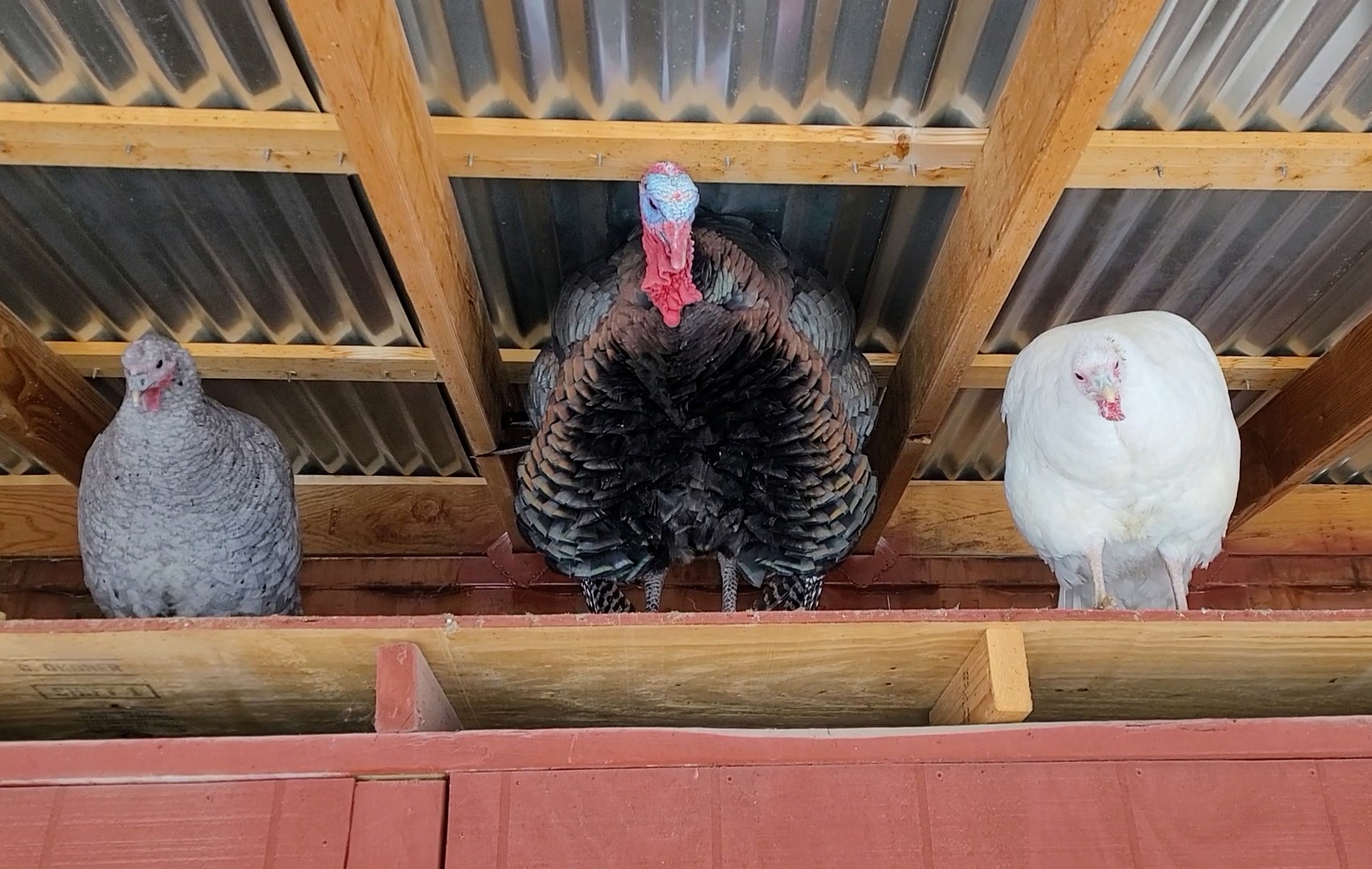 The turkeys and laying hens were not eager to emerge from their warm roosts.