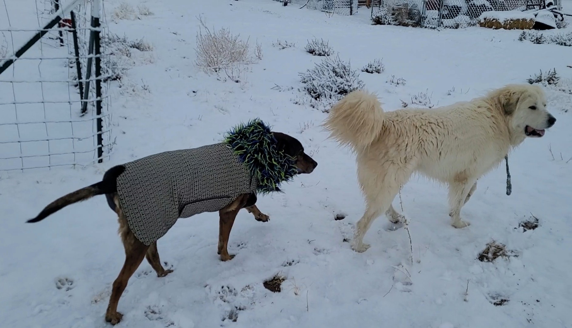 Brisket had to don his Fashion Monster jacket and greet his colleague, the livestock guardian dog Amaroq.