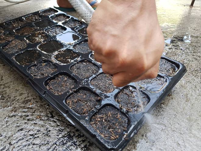 First, we filled in the holes of the tray with planting soil. This is not the usual soil on the ground, and is what they call a potting mix. Its a medium used for planting in containers because pure soil is "too heavy". The ingredients of a potting mix can vary but the one we're using have sand, compost, and rice hulks (most of which are burned).