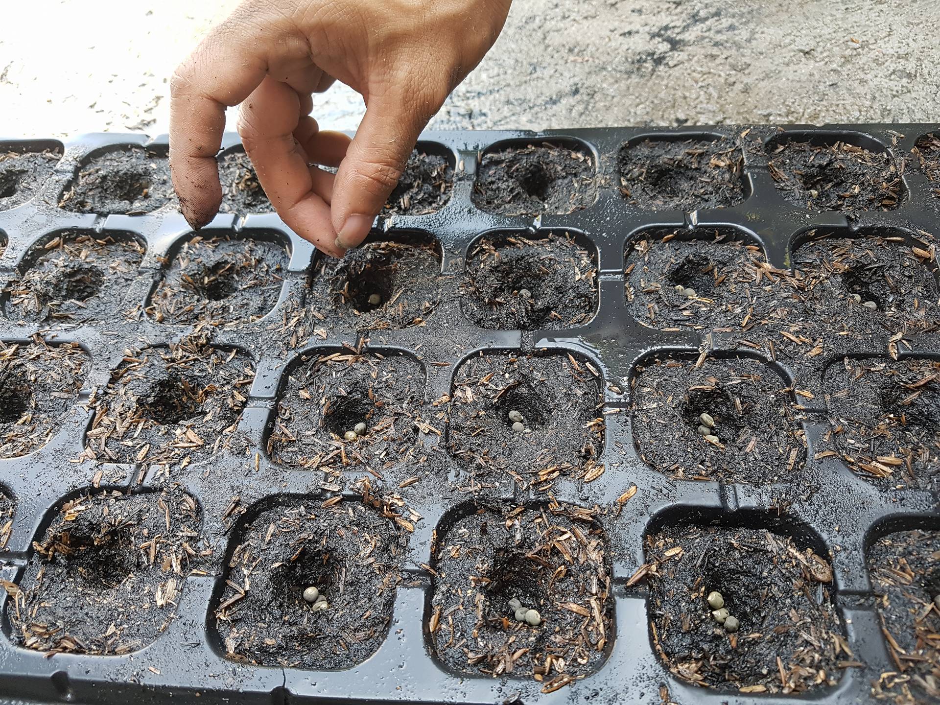 Okras are very easy to grow. Its seeds are some of the most resilient I've encountered. They don't need much in order to germinate and when they've grown into mature plants, they need very little. We use seedling trays in growing our crops because seeds in general are touchy. They are sensitive to light and water, and growing them in seedling trays makes it easier to control those factors. We can easily move them around to avoid exposing them to too much sunlight. The tray offers good drainage system thanks to the holes on them. This means there's less possibility of the seed rotting because of too much water.